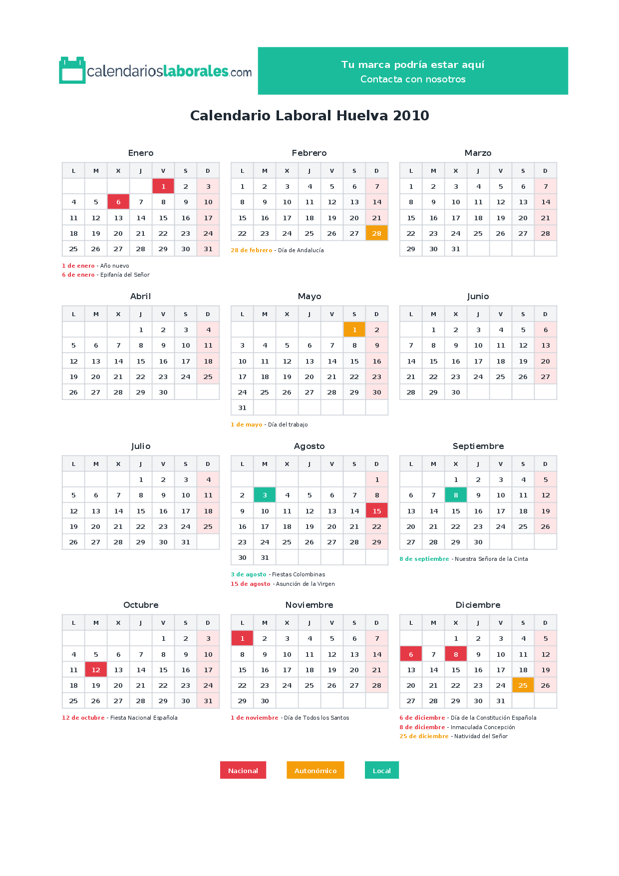 El calendario laboral de Huelva en 2010 cuenta con un total de 12 días festivos, que incluyen festivos nacionales, festivos autonómicos de Andalucía y los festivos locales establecidos por cada municipio.