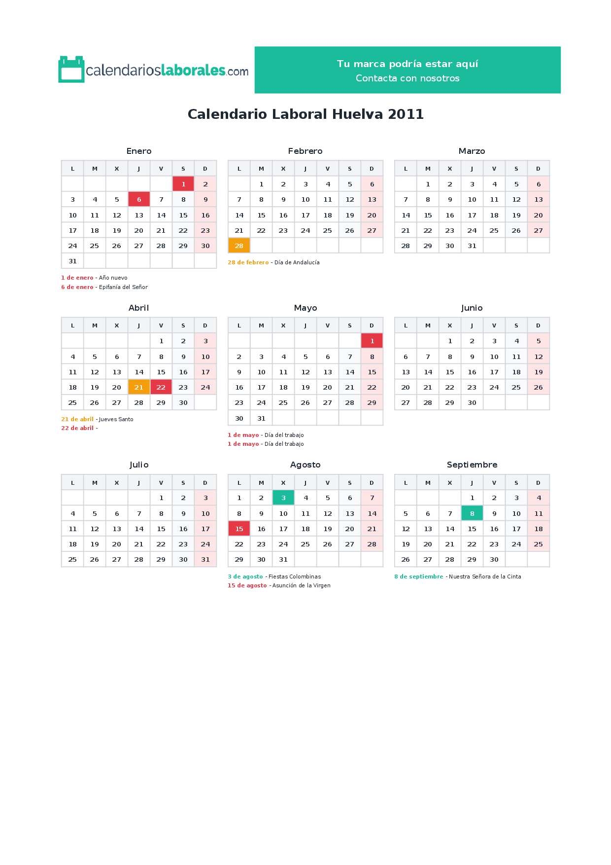 El calendario laboral de Huelva en 2011 cuenta con un total de 14 días festivos, que incluyen festivos nacionales, festivos autonómicos de Andalucía y los festivos locales establecidos por cada municipio.