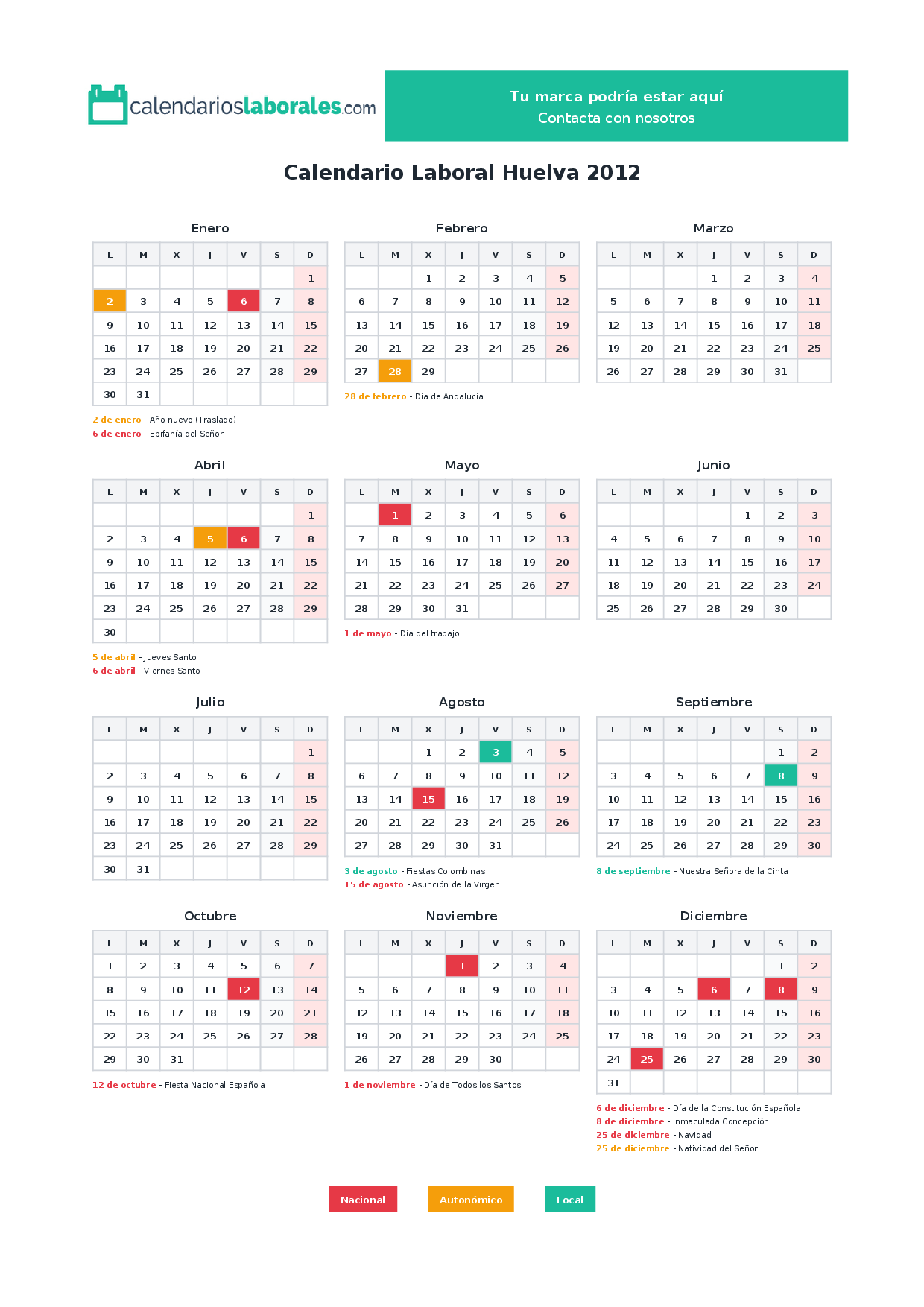 El calendario laboral de Huelva en 2012 cuenta con un total de 14 días festivos, que incluyen festivos nacionales, festivos autonómicos de Andalucía y los festivos locales establecidos por cada municipio.