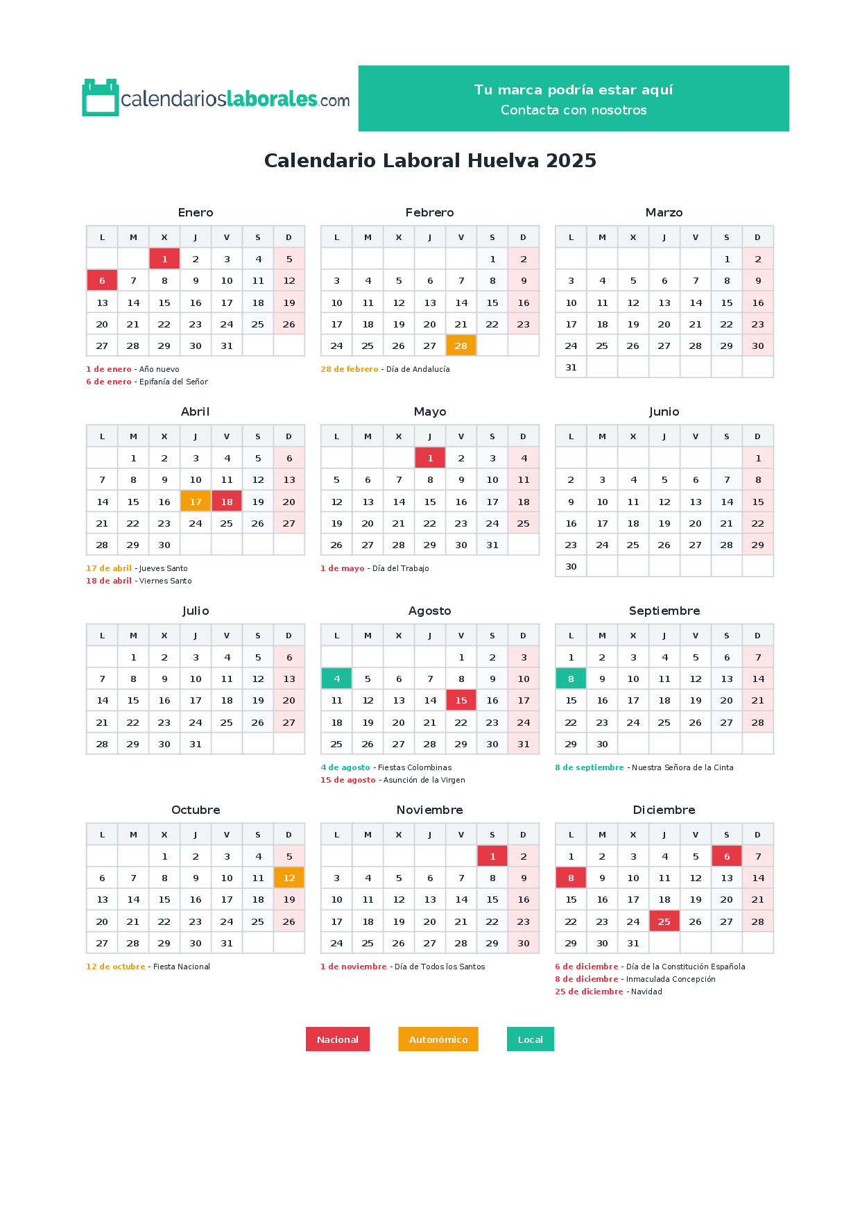 El calendario laboral de Huelva en 2025 cuenta con un total de 14 días festivos, que incluyen festivos nacionales, festivos autonómicos de Andalucía y los festivos locales establecidos por cada municipio.