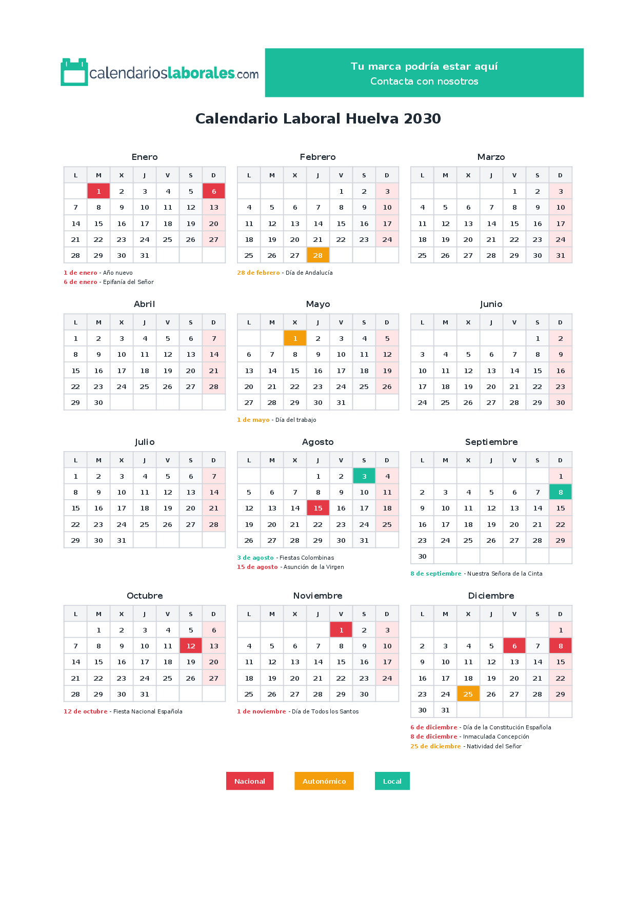 El calendario laboral de Huelva en 2030 cuenta con un total de 12 días festivos, que incluyen festivos nacionales, festivos autonómicos de Andalucía y los festivos locales establecidos por cada municipio.