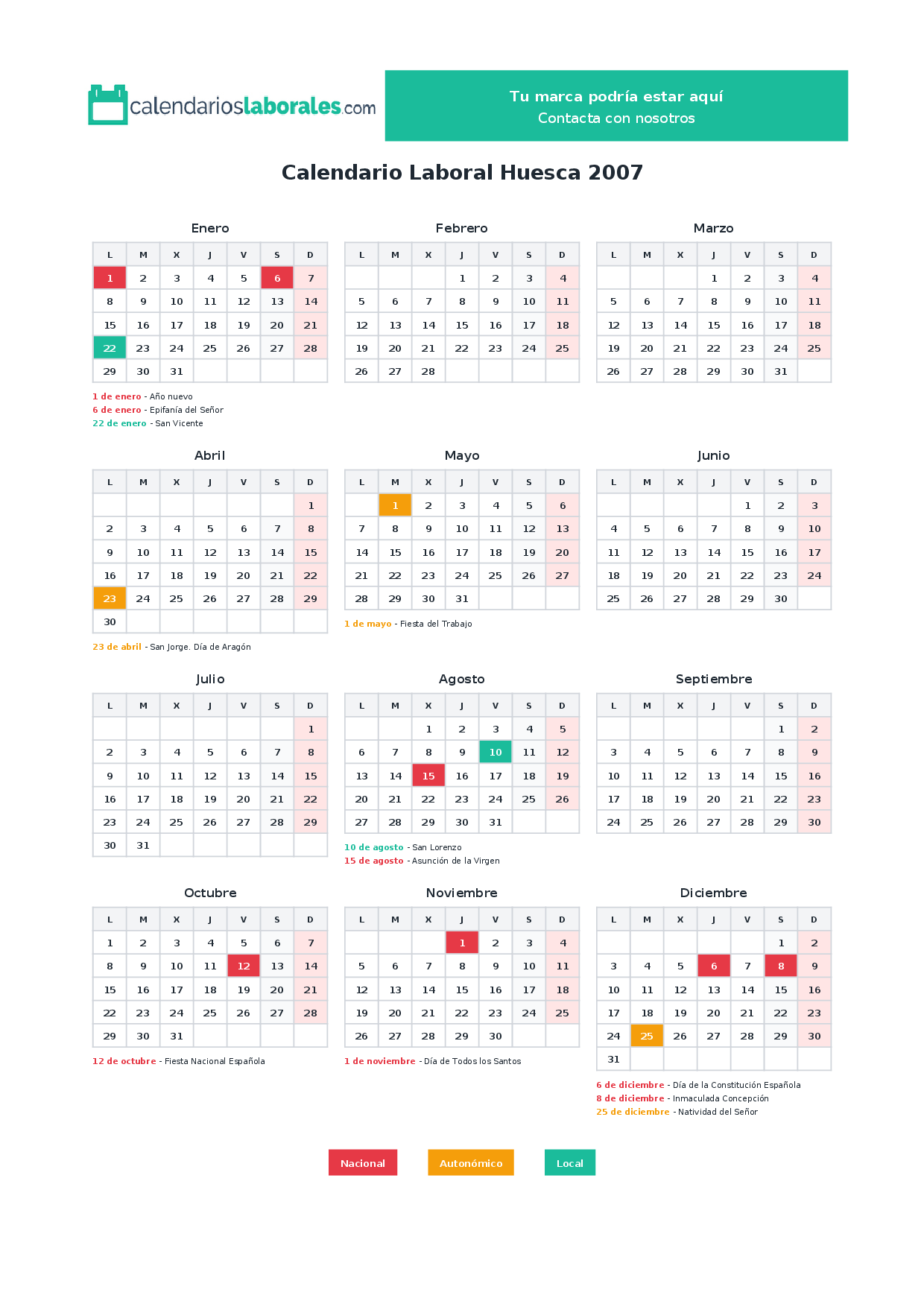 El calendario laboral de Huesca en 2007 cuenta con un total de 12 días festivos, que incluyen festivos nacionales, festivos autonómicos de Aragón y los festivos locales establecidos por cada municipio.