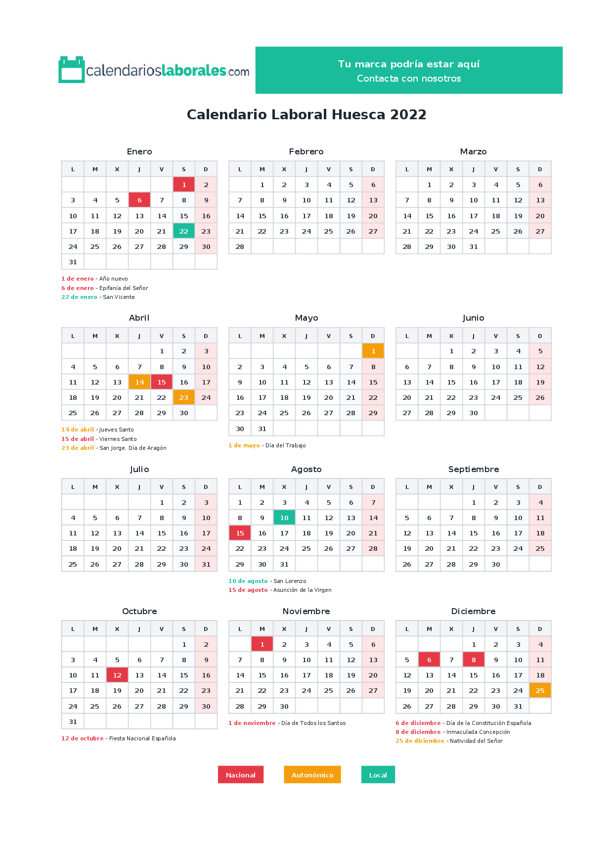 El calendario laboral de Huesca en 2022 cuenta con un total de 14 días festivos, que incluyen festivos nacionales, festivos autonómicos de Aragón y los festivos locales establecidos por cada municipio.