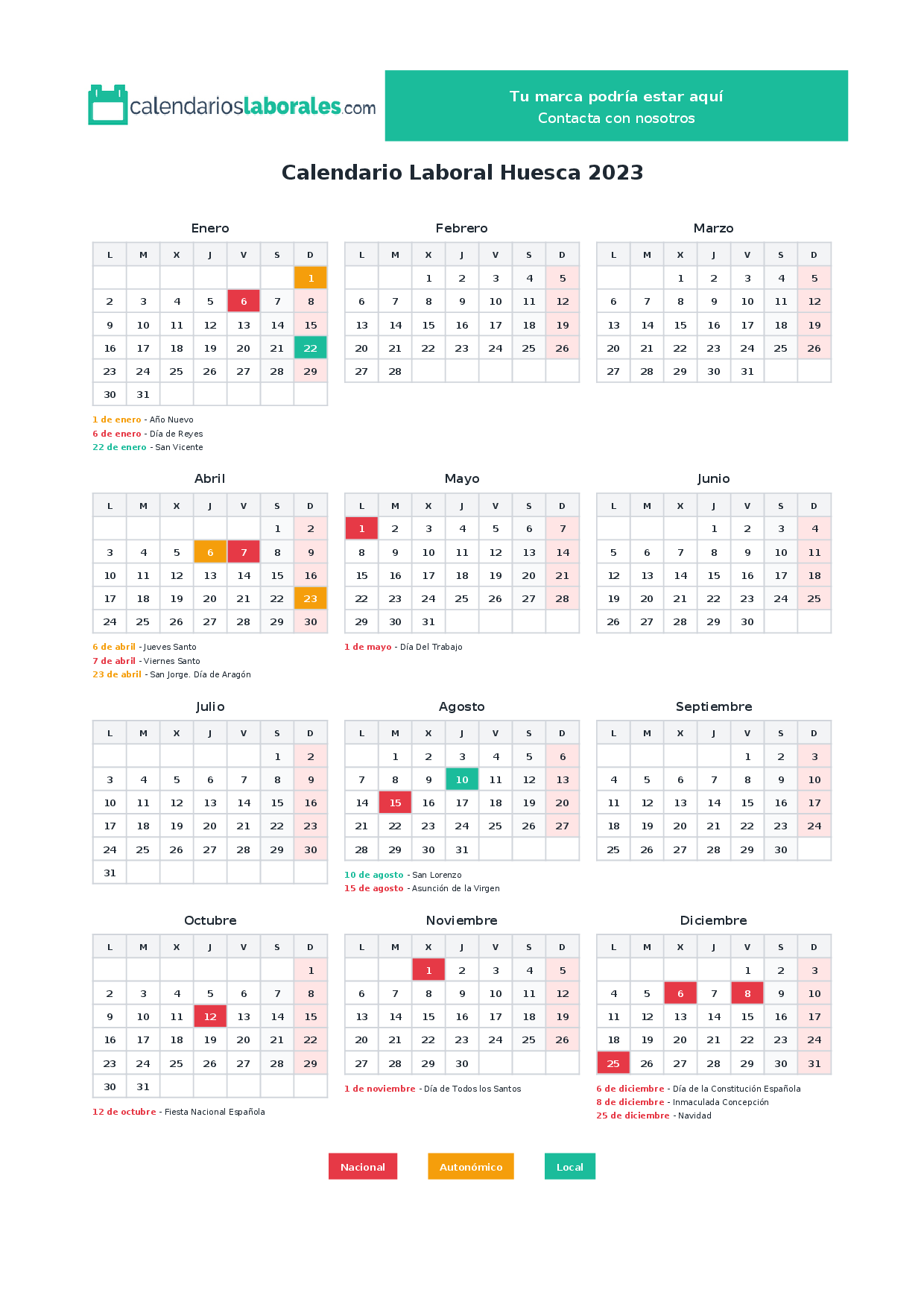 El calendario laboral de Huesca en 2023 cuenta con un total de 14 días festivos, que incluyen festivos nacionales, festivos autonómicos de Aragón y los festivos locales establecidos por cada municipio.