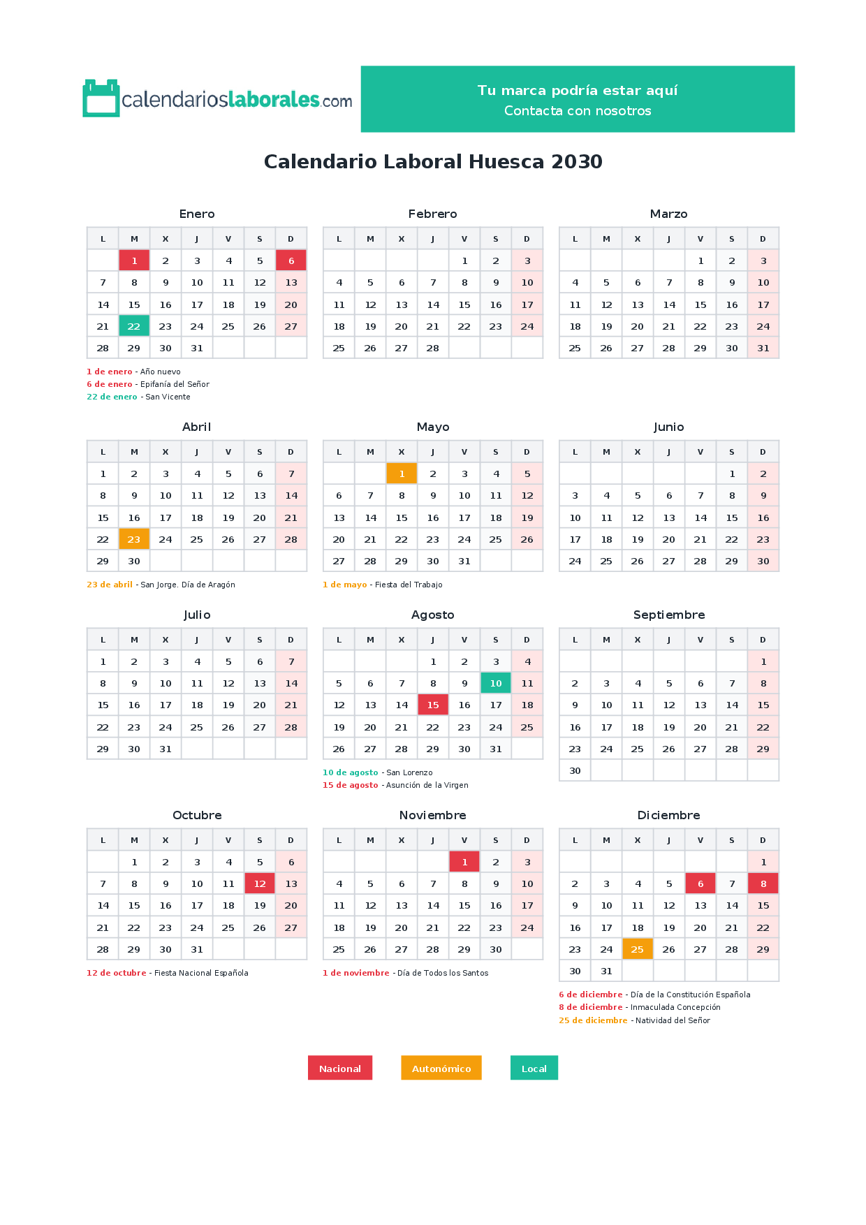El calendario laboral de Huesca en 2030 cuenta con un total de 12 días festivos, que incluyen festivos nacionales, festivos autonómicos de Aragón y los festivos locales establecidos por cada municipio.