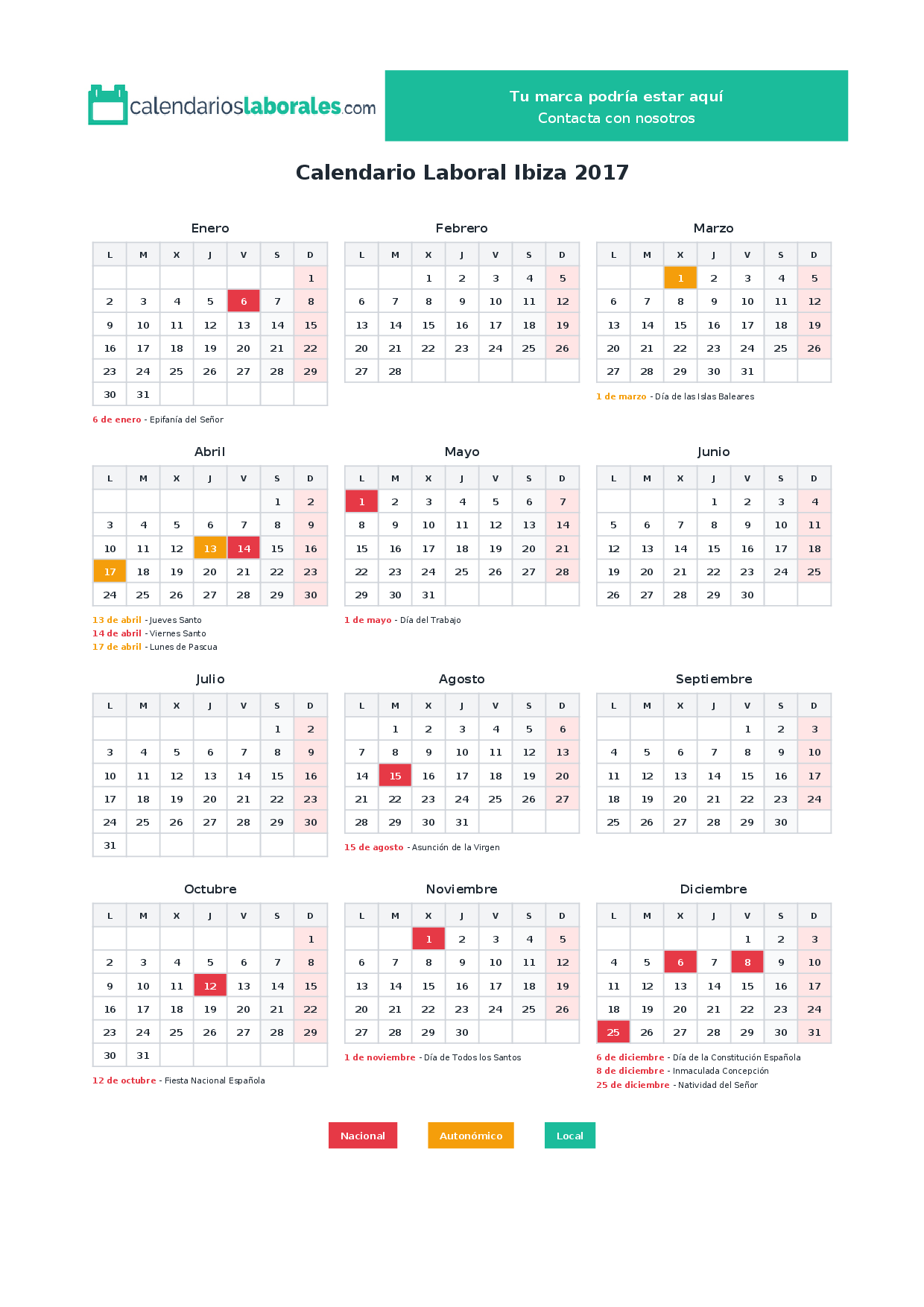 El calendario laboral de Ibiza en 2017 incluye un total de 12 días festivos, que combinan festivos nacionales, festivos autonómicos de Baleares y los festivos locales propios del municipio.