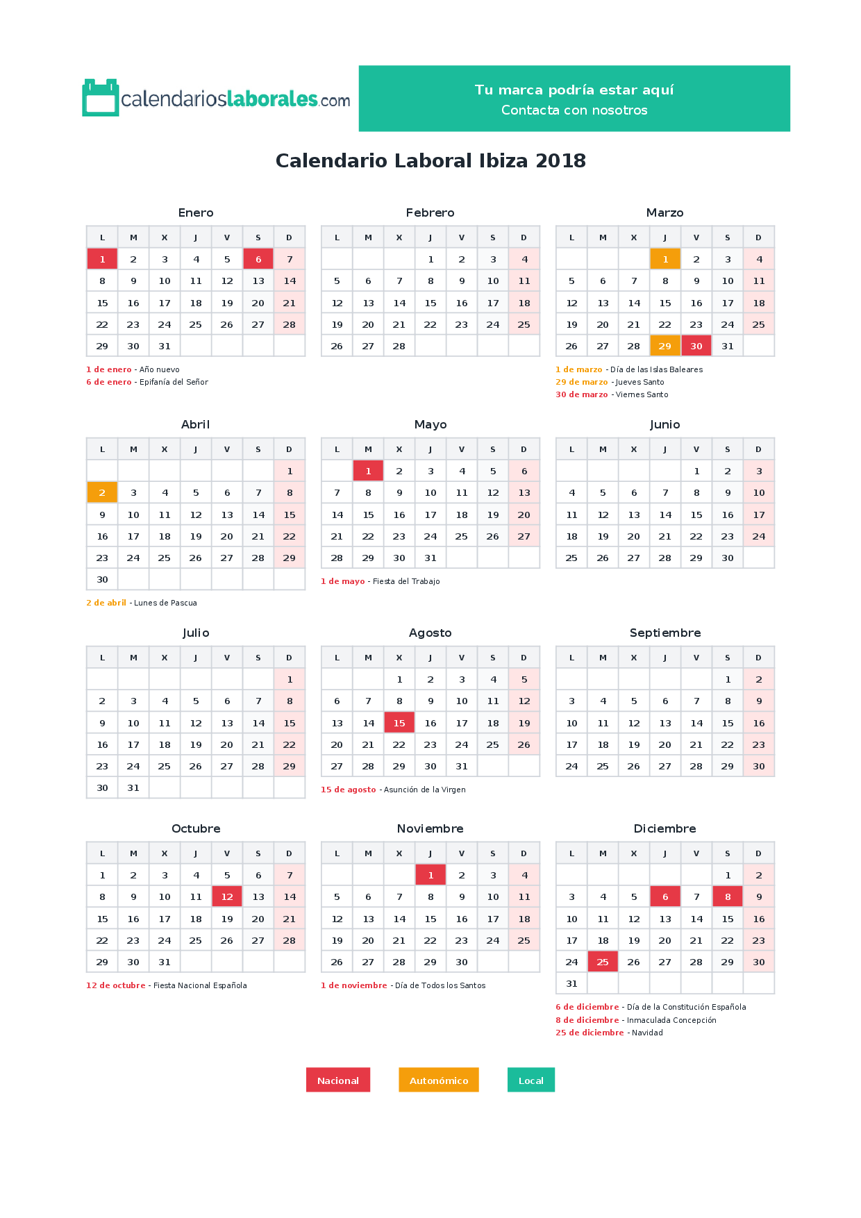 El calendario laboral de Ibiza en 2018 incluye un total de 13 días festivos, que combinan festivos nacionales, festivos autonómicos de Baleares y los festivos locales propios del municipio.