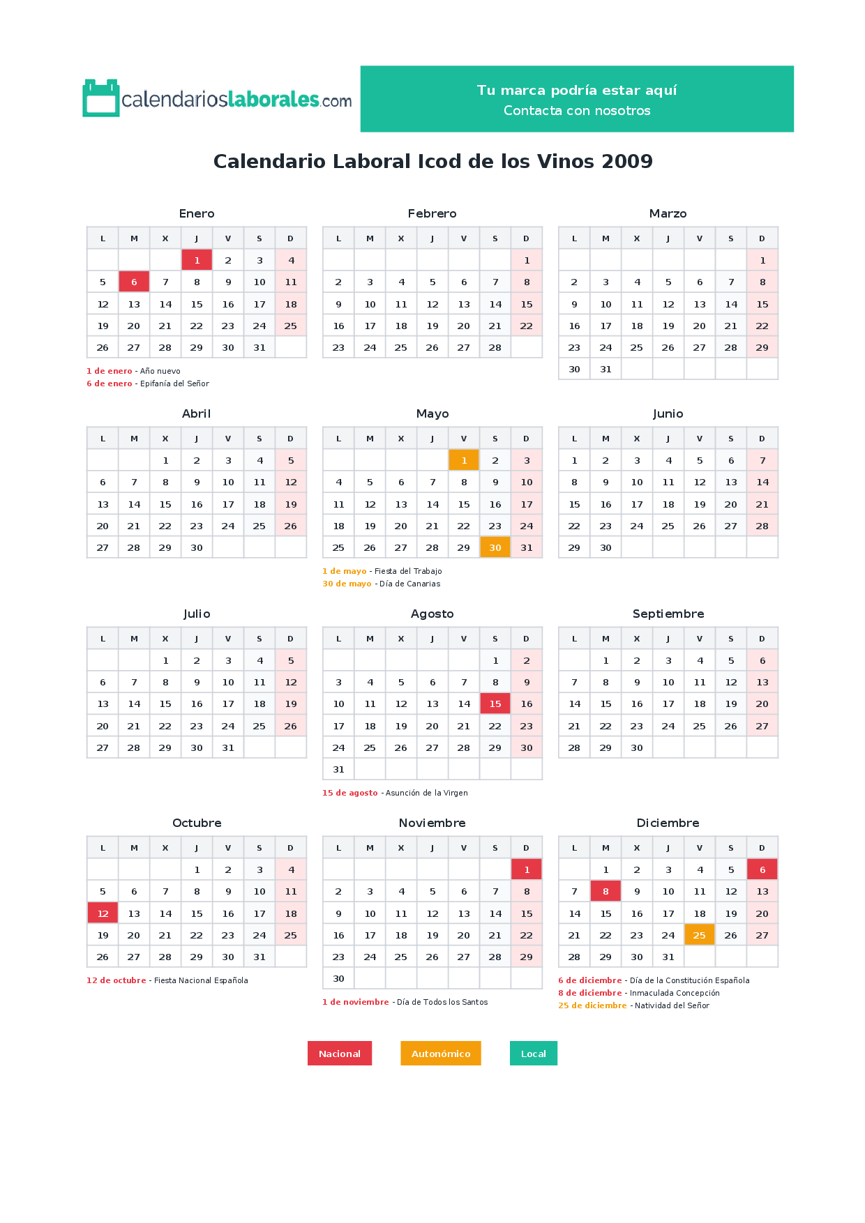 En 2009, 7 festivos nacionales se celebran en todo el territorio español, incluidos en el calendario laboral de Icod de los Vinos.