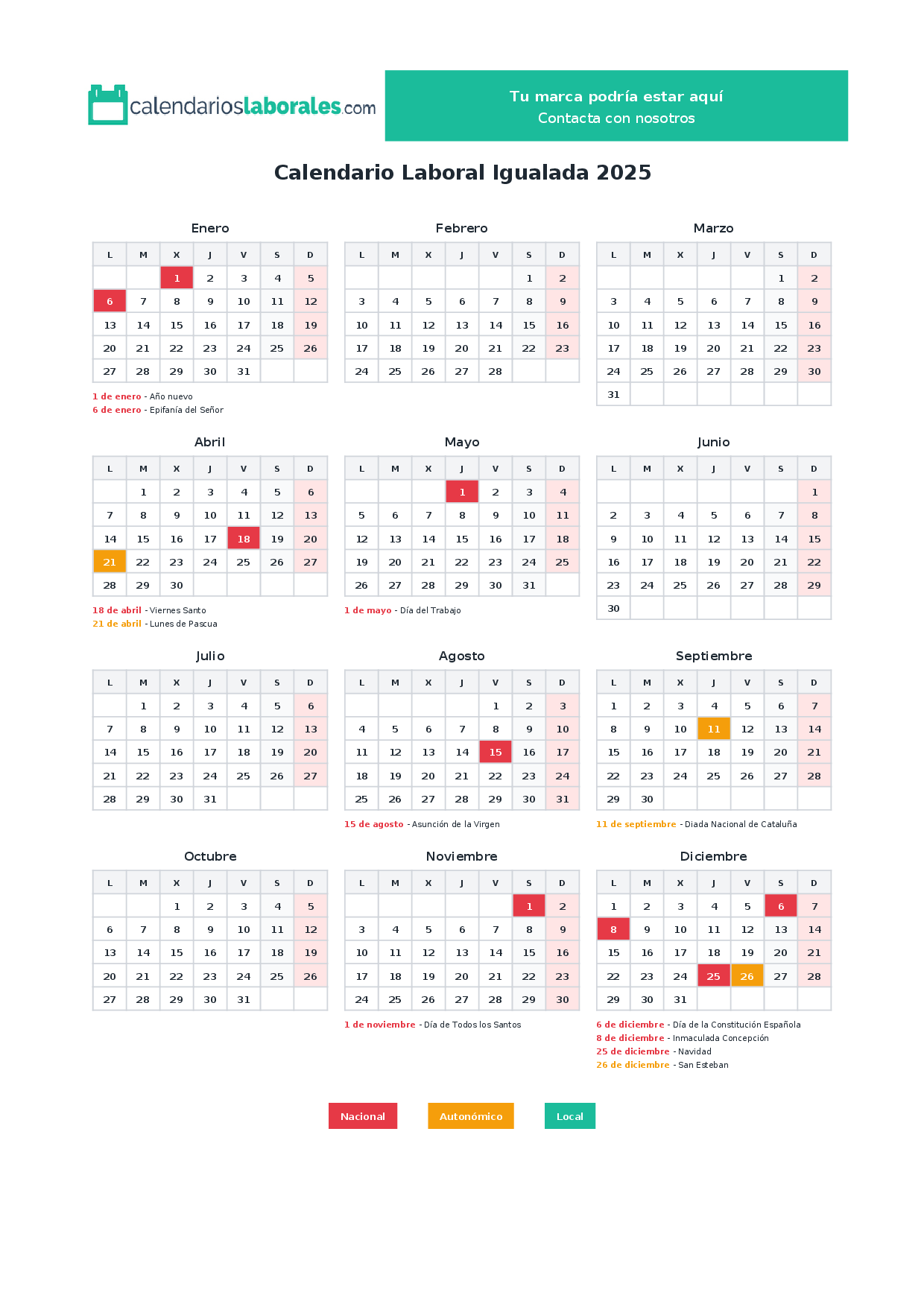 En 2025, 9 festivos nacionales se celebran en todo el territorio español, incluidos en el calendario laboral de Igualada.