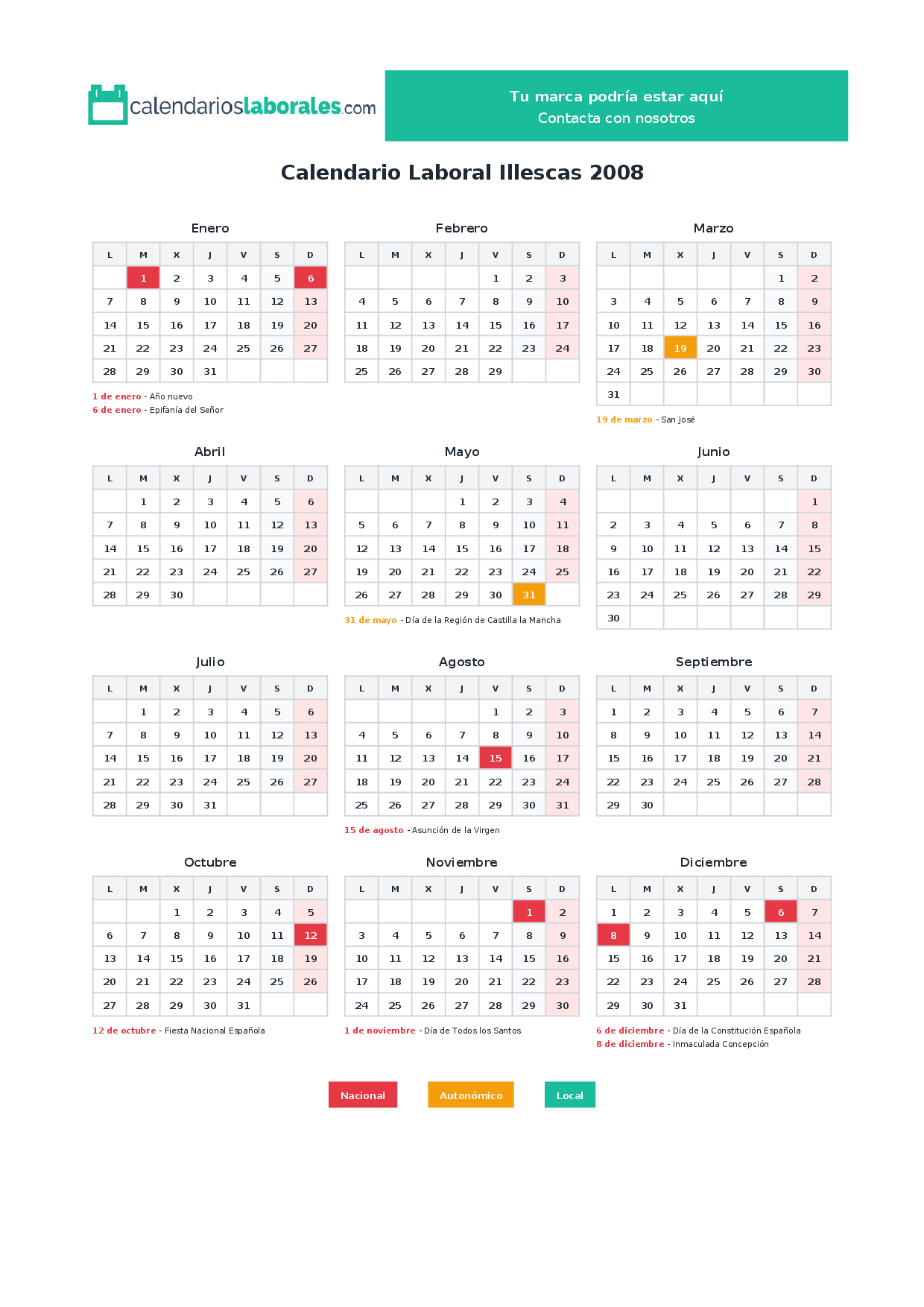 En 2008, 7 festivos nacionales se celebran en todo el territorio español, incluidos en el calendario laboral de Illescas.