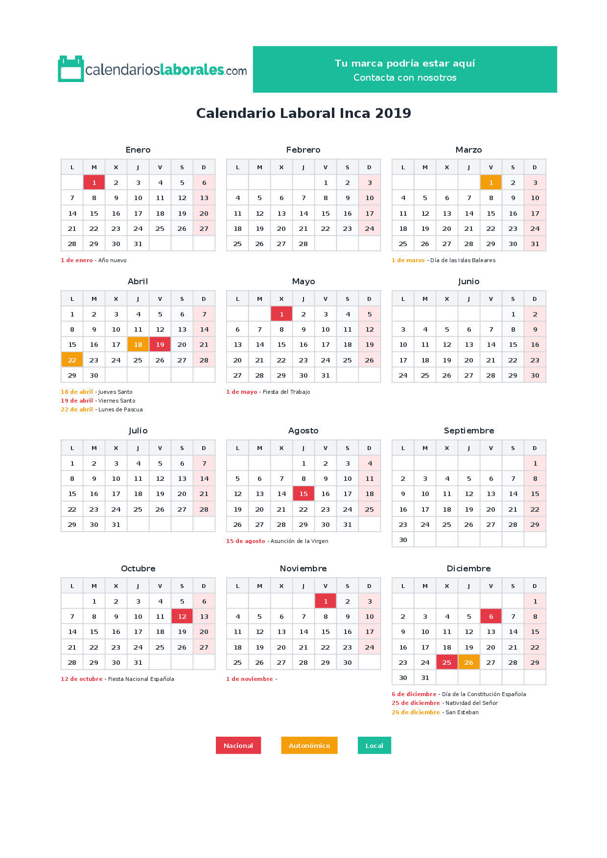 En 2019, 8 festivos nacionales se celebran en todo el territorio español, incluidos en el calendario laboral de Inca.