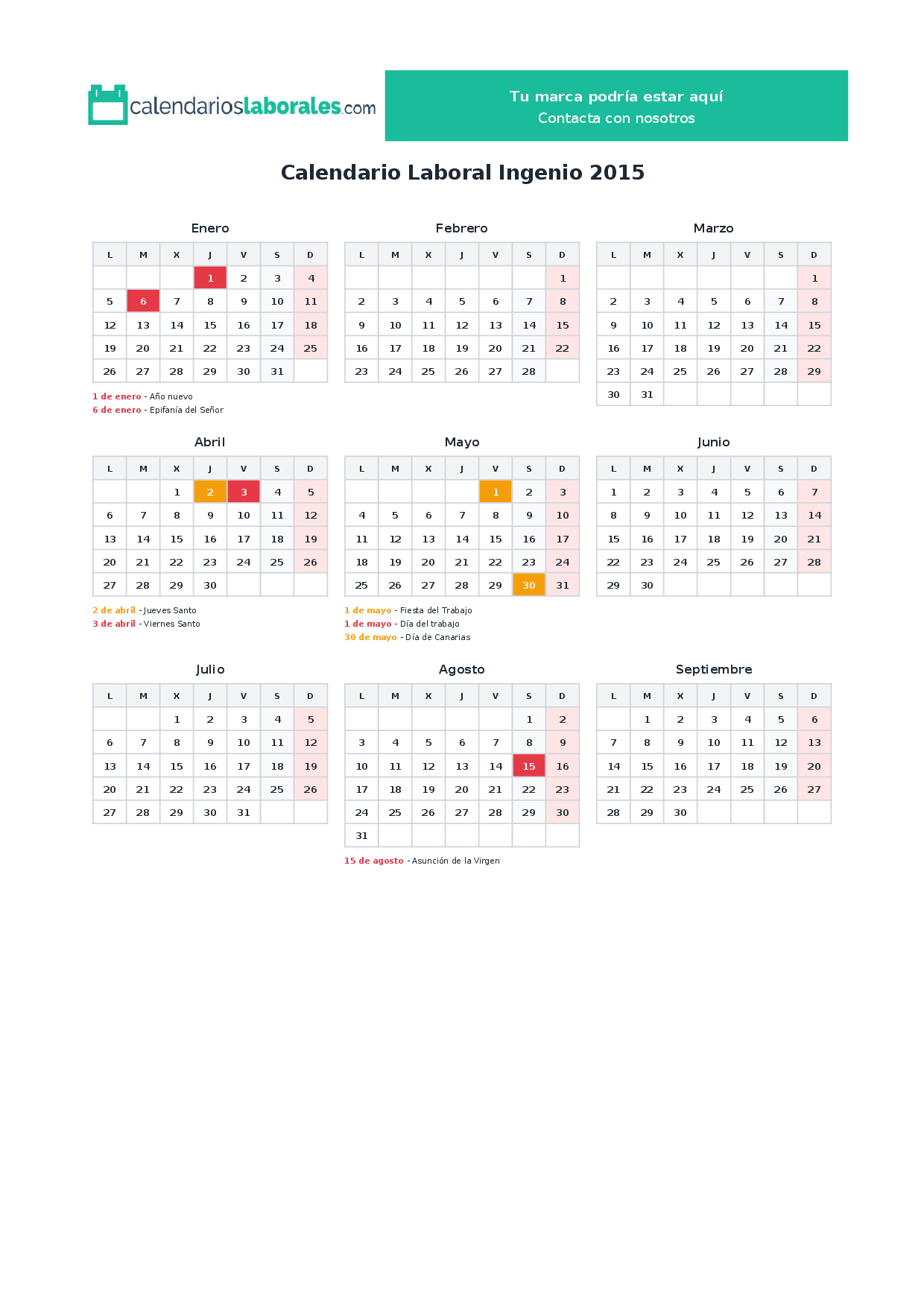 En 2015, 20 festivos nacionales se celebran en todo el territorio español, incluidos en el calendario laboral de Ingenio.