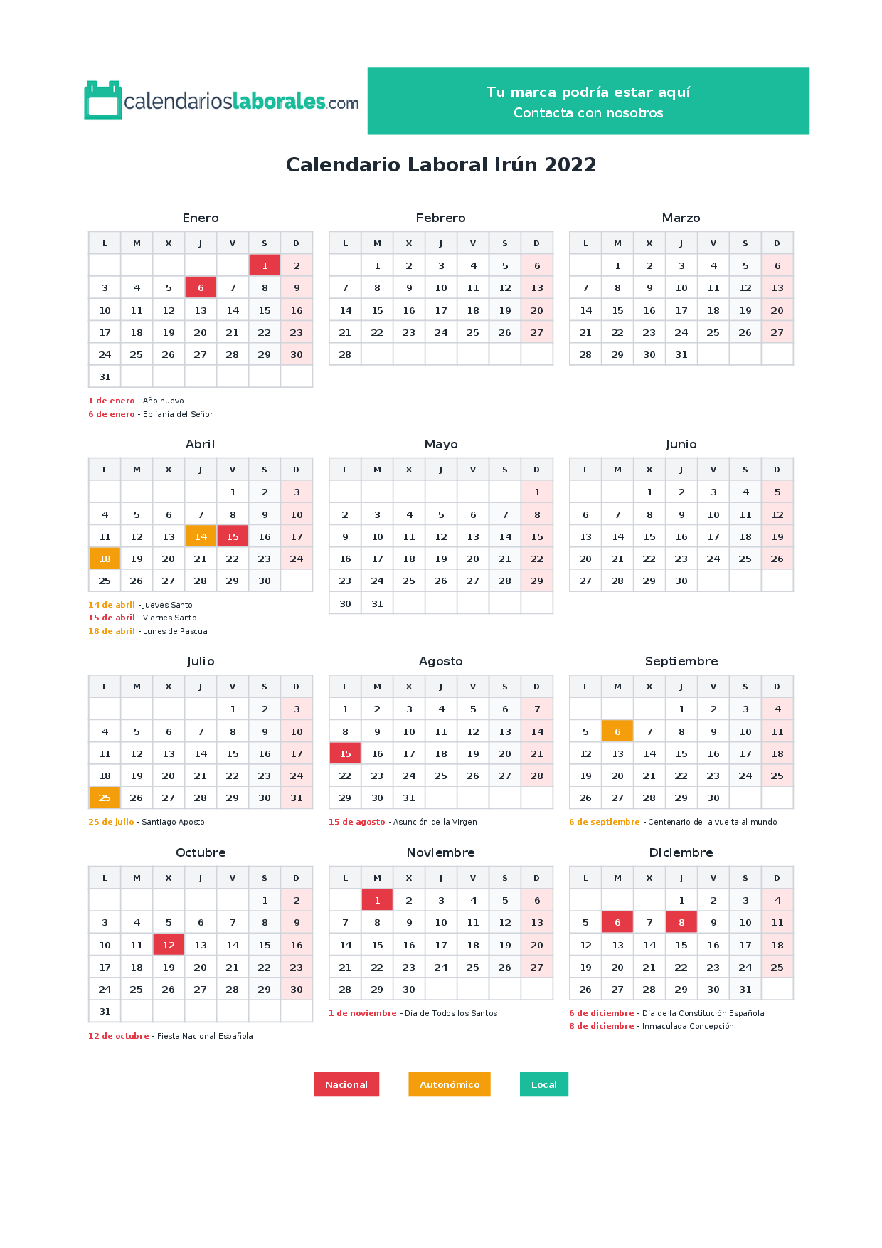 El calendario laboral de Irún en 2022 incluye un total de 12 días festivos, que combinan festivos nacionales, festivos autonómicos de País Vasco y los festivos locales propios del municipio.