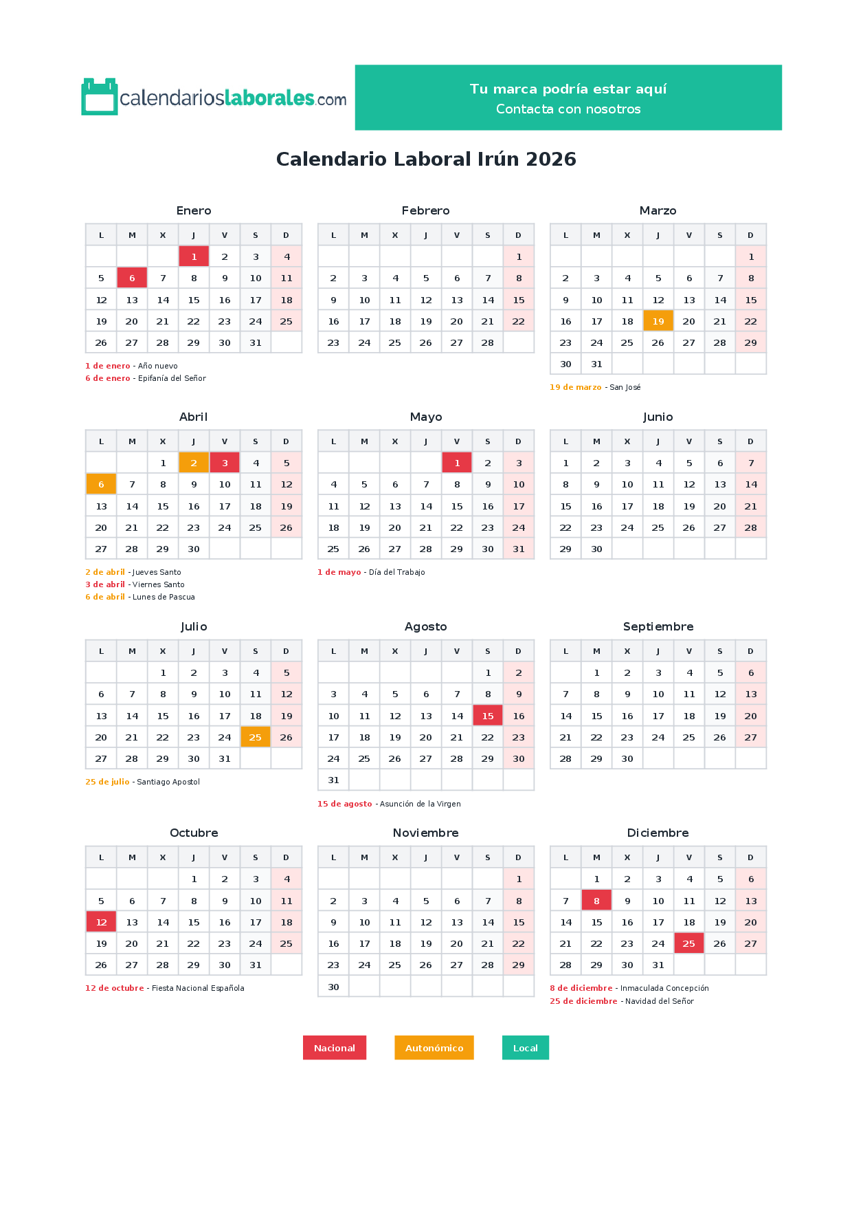 Calendario laboral Irún 2026
