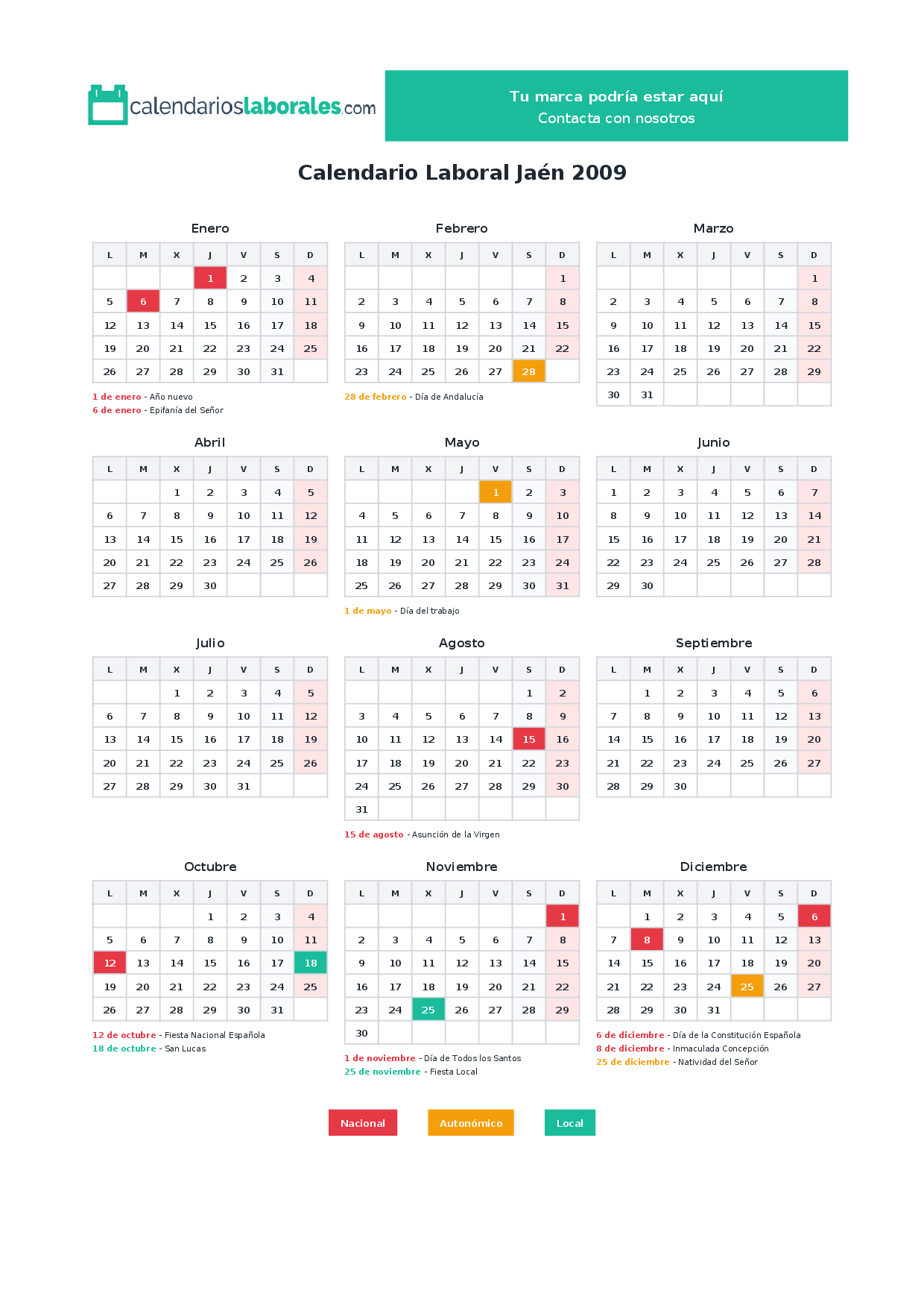 El calendario laboral de Jaén en 2009 cuenta con un total de 12 días festivos, que incluyen festivos nacionales, festivos autonómicos de Andalucía y los festivos locales establecidos por cada municipio.