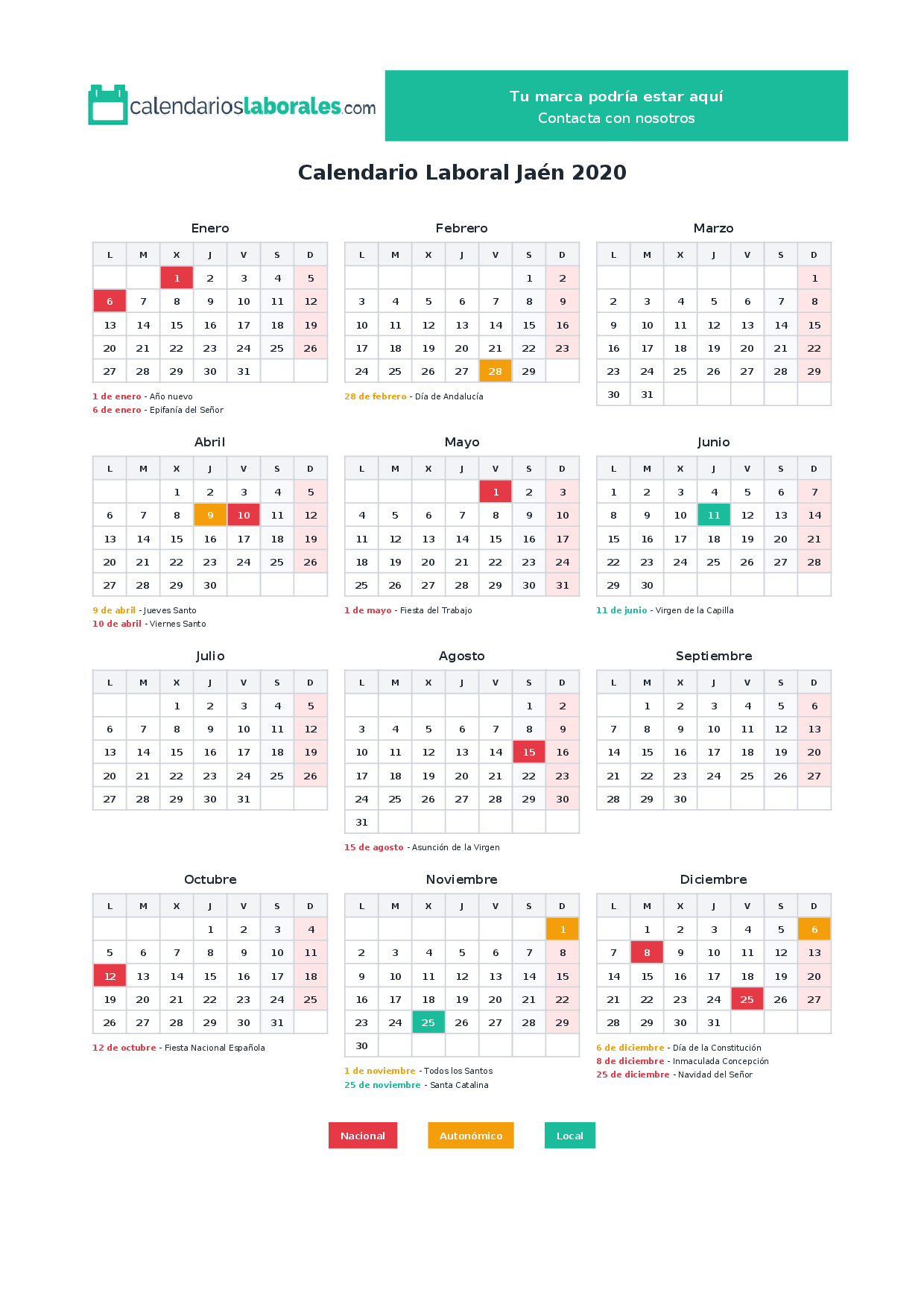 El calendario laboral de Jaén en 2020 cuenta con un total de 14 días festivos, que incluyen festivos nacionales, festivos autonómicos de Andalucía y los festivos locales establecidos por cada municipio.