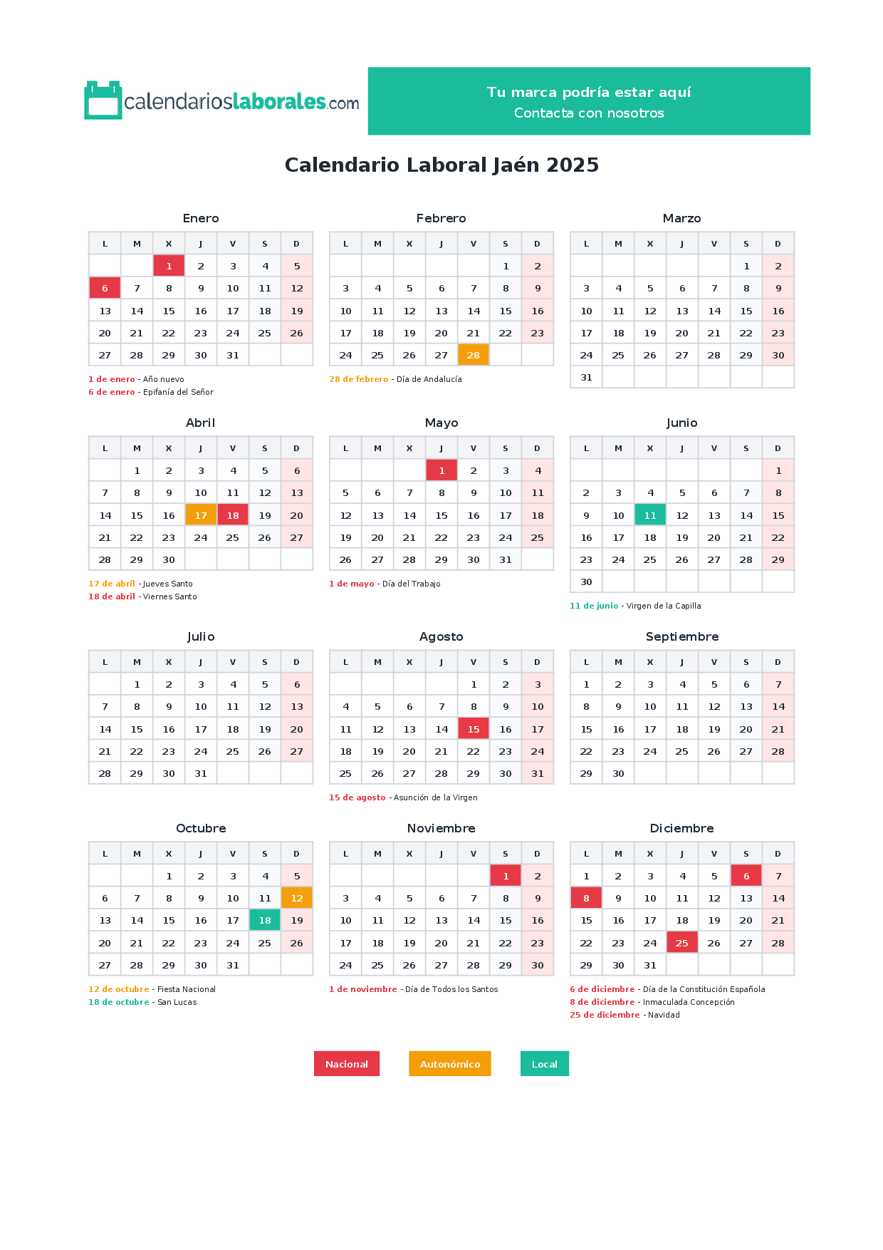 El calendario laboral de Jaén en 2025 cuenta con un total de 14 días festivos, que incluyen festivos nacionales, festivos autonómicos de Andalucía y los festivos locales establecidos por cada municipio.