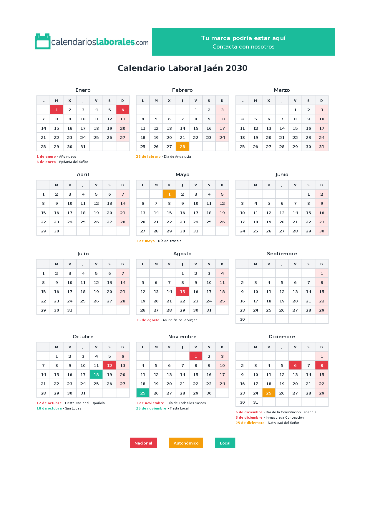 El calendario laboral de Jaén en 2030 cuenta con un total de 12 días festivos, que incluyen festivos nacionales, festivos autonómicos de Andalucía y los festivos locales establecidos por cada municipio.