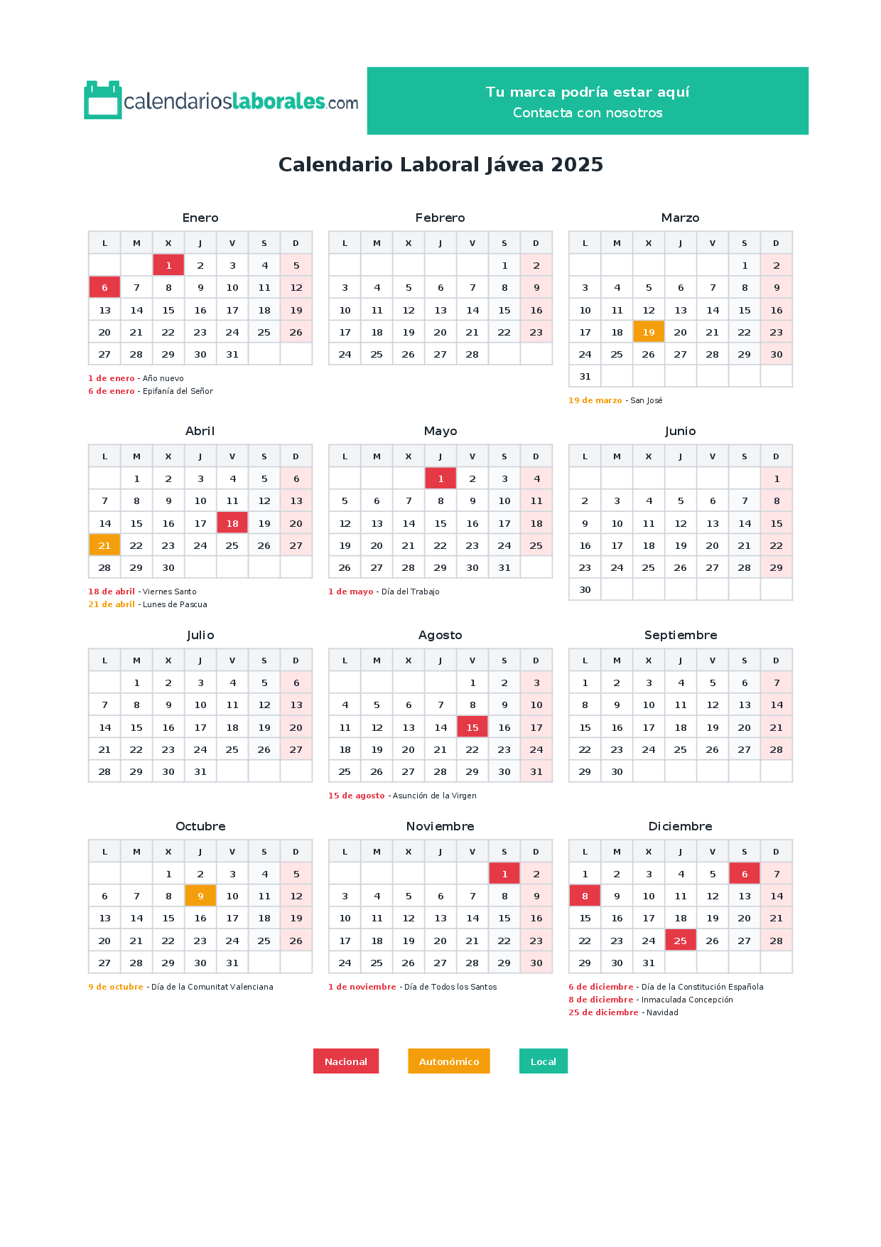 Además, el Ayuntamiento de Jávea fija 0 festivos locales que completan el calendario laboral del municipio.