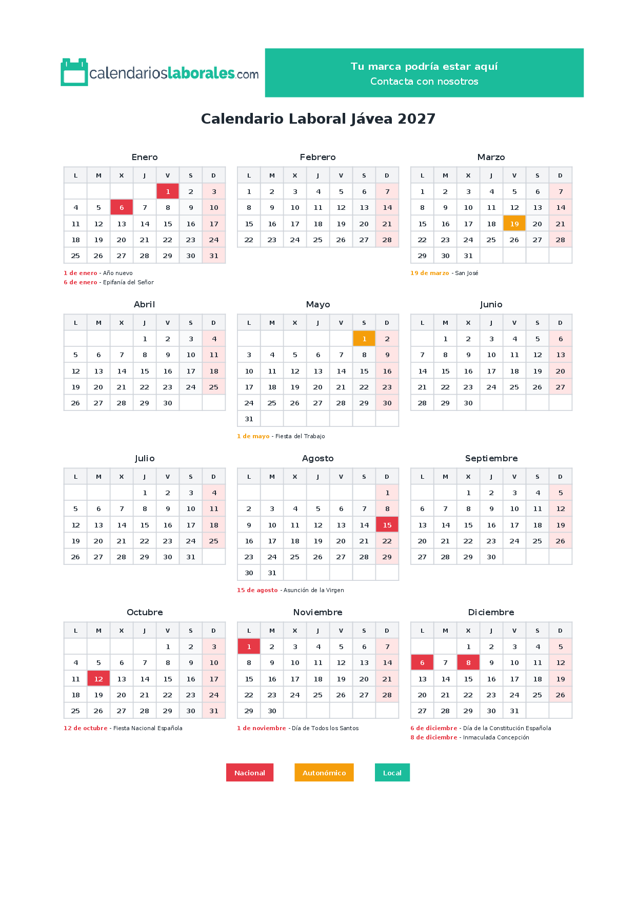 Además, el Ayuntamiento de Jávea fija 0 festivos locales que completan el calendario laboral del municipio.