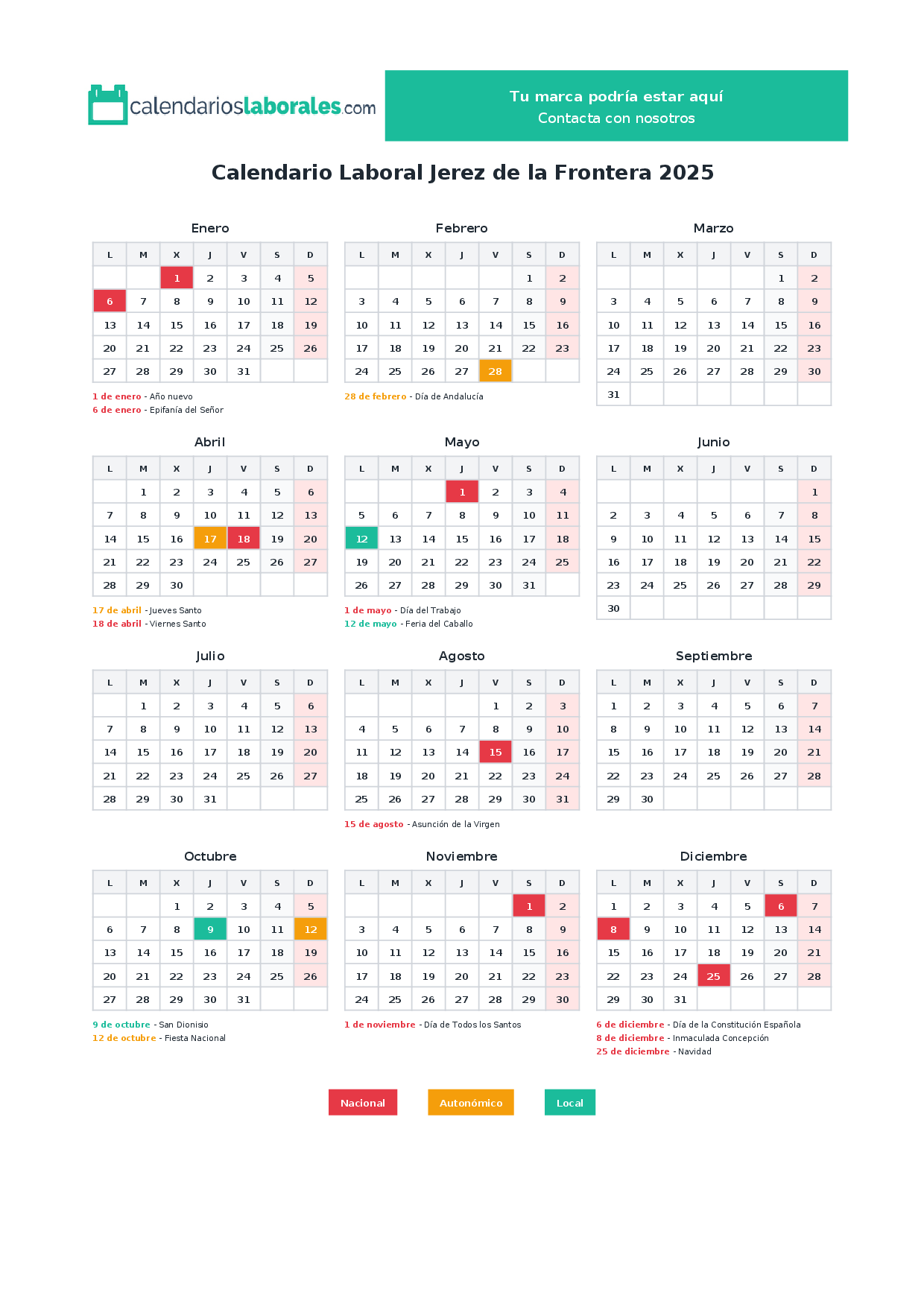 Además, el Ayuntamiento de Jerez de la Frontera fija 2 festivos locales que completan el calendario laboral del municipio.