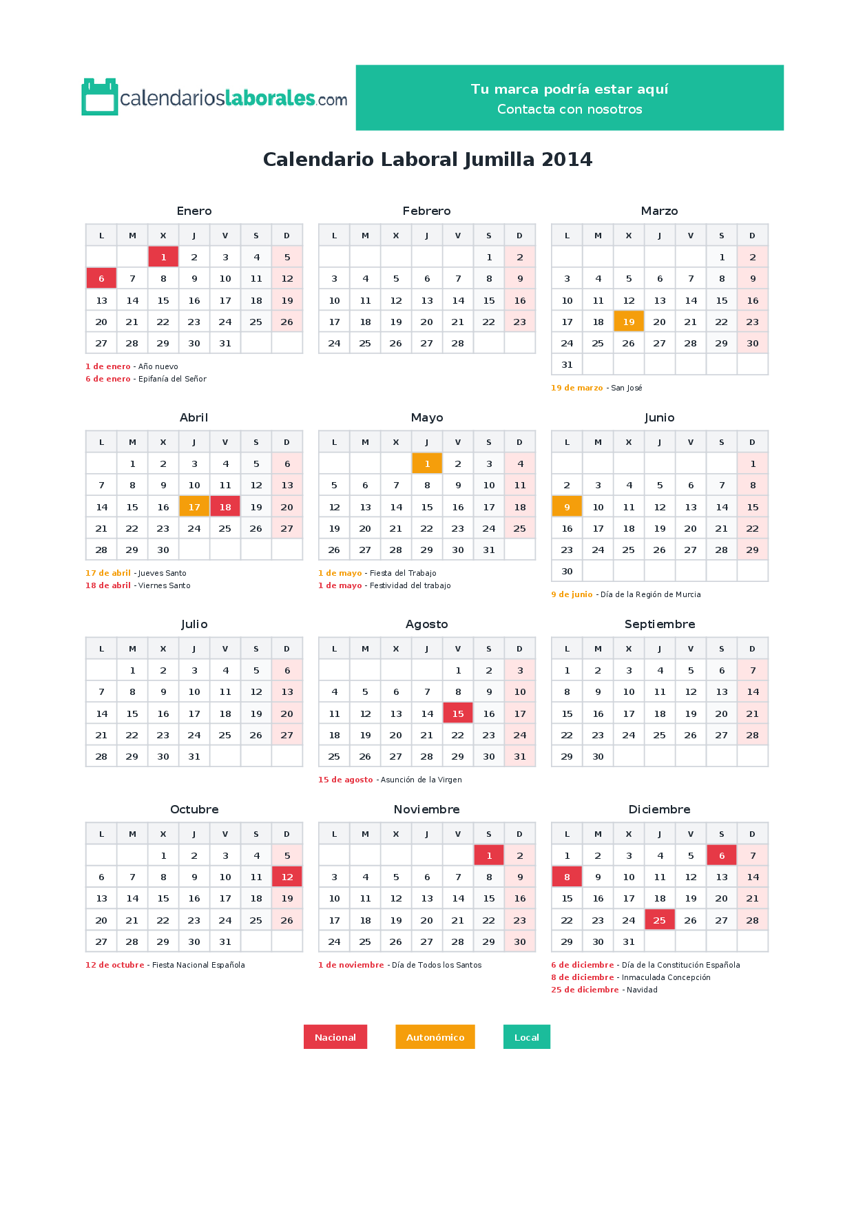 En 2014, 10 festivos nacionales se celebran en todo el territorio español, incluidos en el calendario laboral de Jumilla.