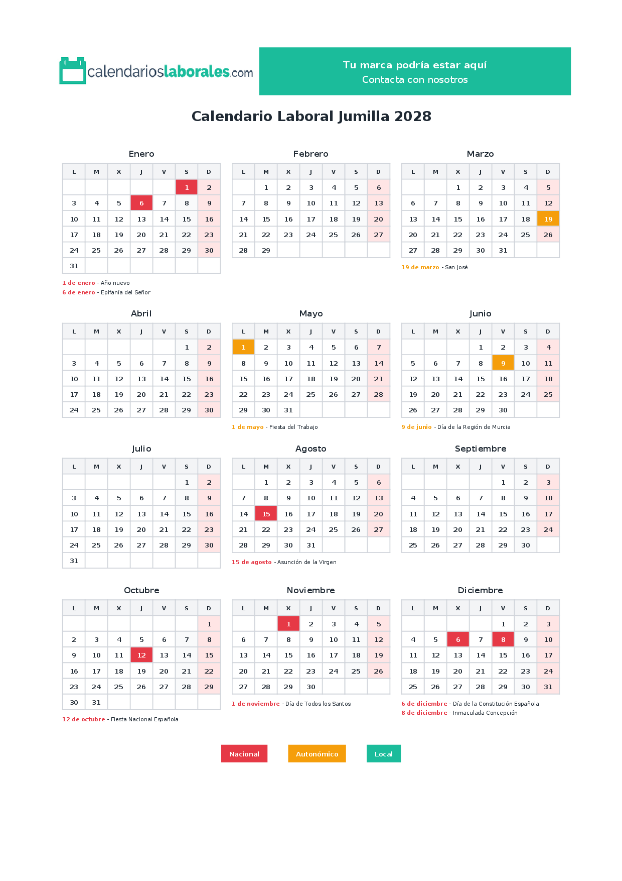 El calendario laboral de Jumilla en 2028 incluye un total de 10 días festivos, que combinan festivos nacionales, festivos autonómicos de Murcia y los festivos locales propios del municipio.