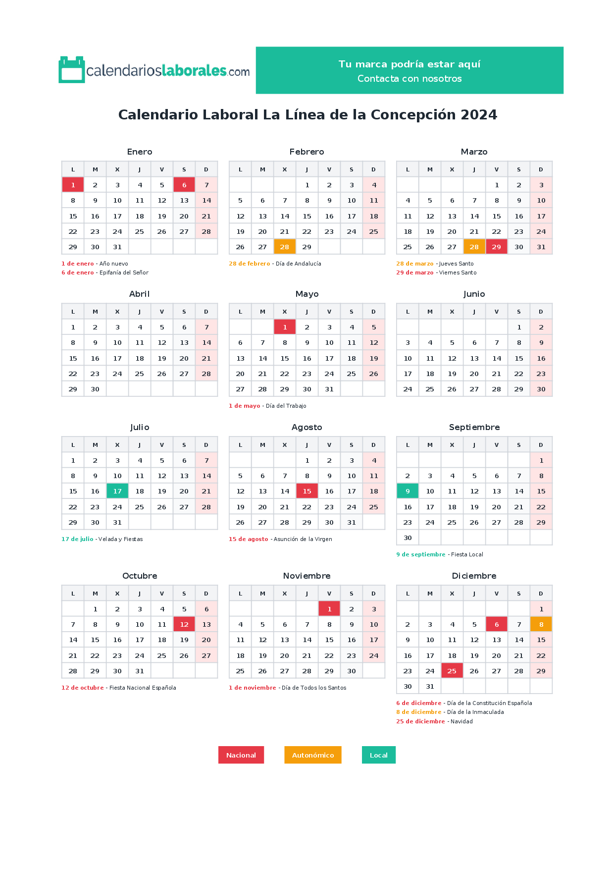 El calendario laboral de La Línea de la Concepción en 2024 incluye un total de 14 días festivos, que combinan festivos nacionales, festivos autonómicos de Andalucía y los festivos locales propios del municipio.