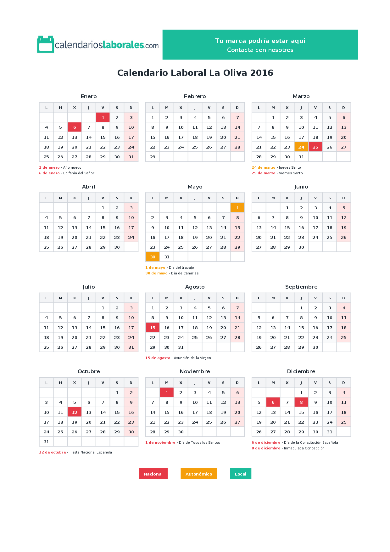 En 2016, 8 festivos nacionales se celebran en todo el territorio español, incluidos en el calendario laboral de La Oliva.