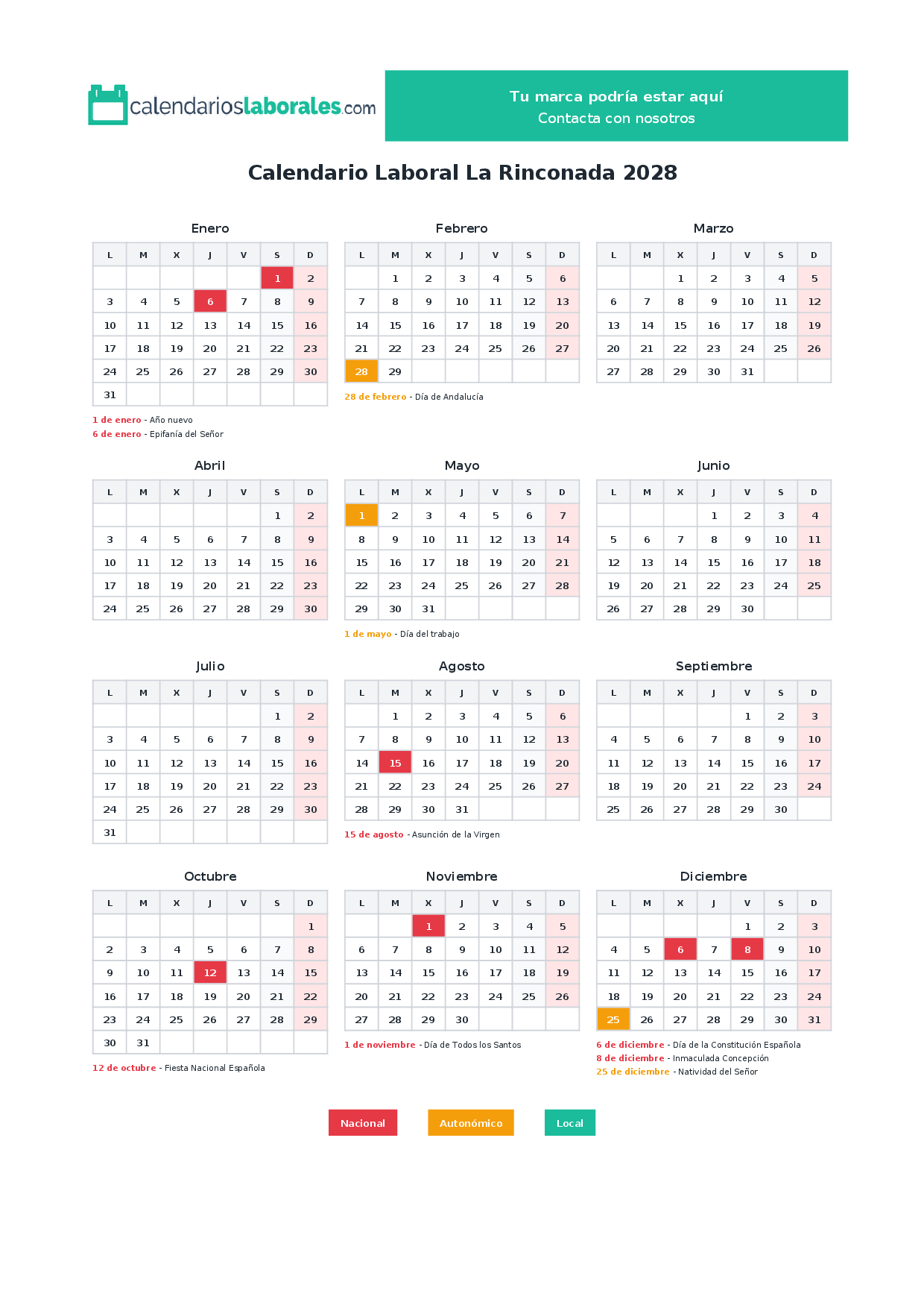 El calendario laboral de La Rinconada en 2028 incluye un total de 10 días festivos, que combinan festivos nacionales, festivos autonómicos de Andalucía y los festivos locales propios del municipio.