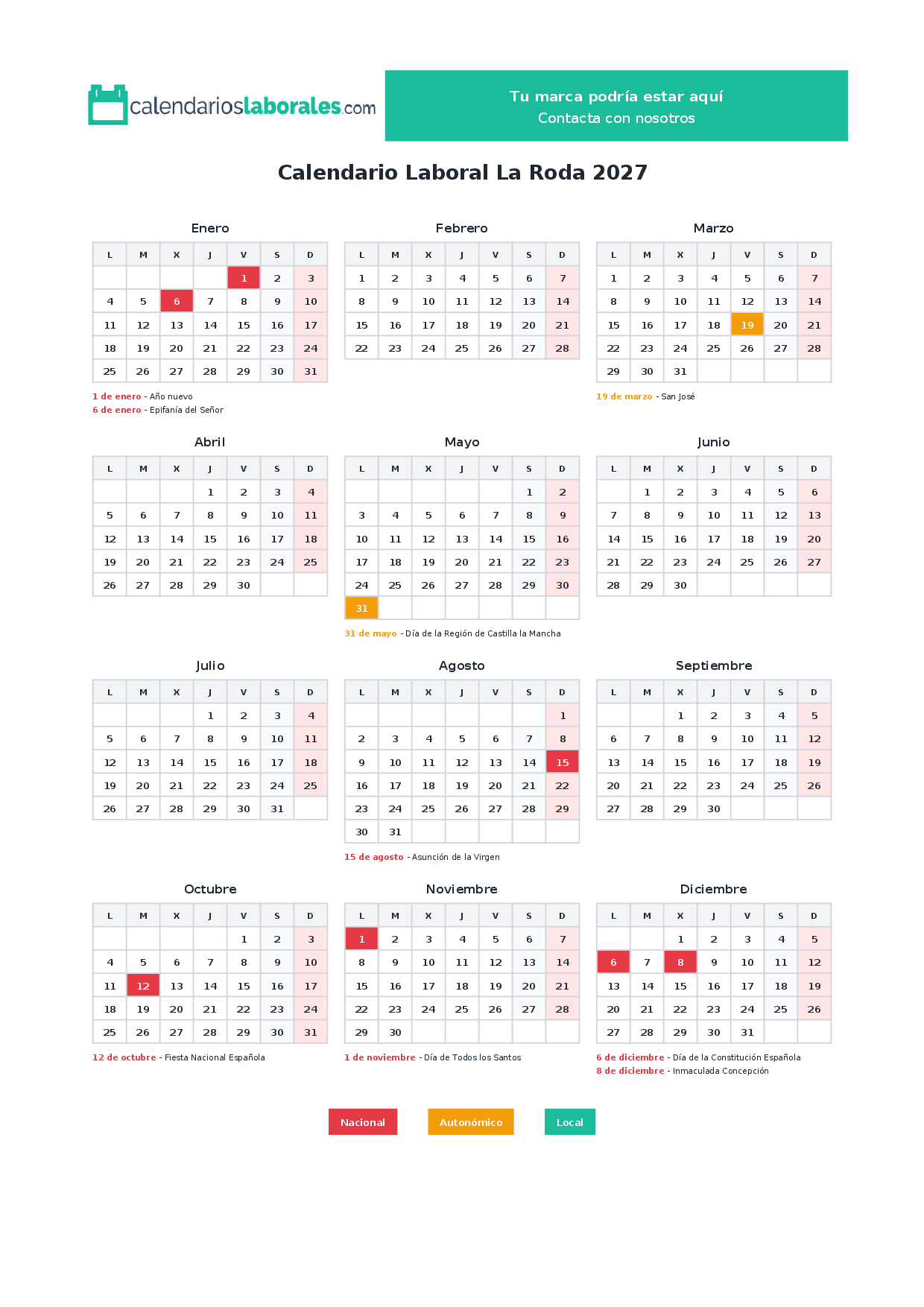 Calendario laboral La Roda 2027