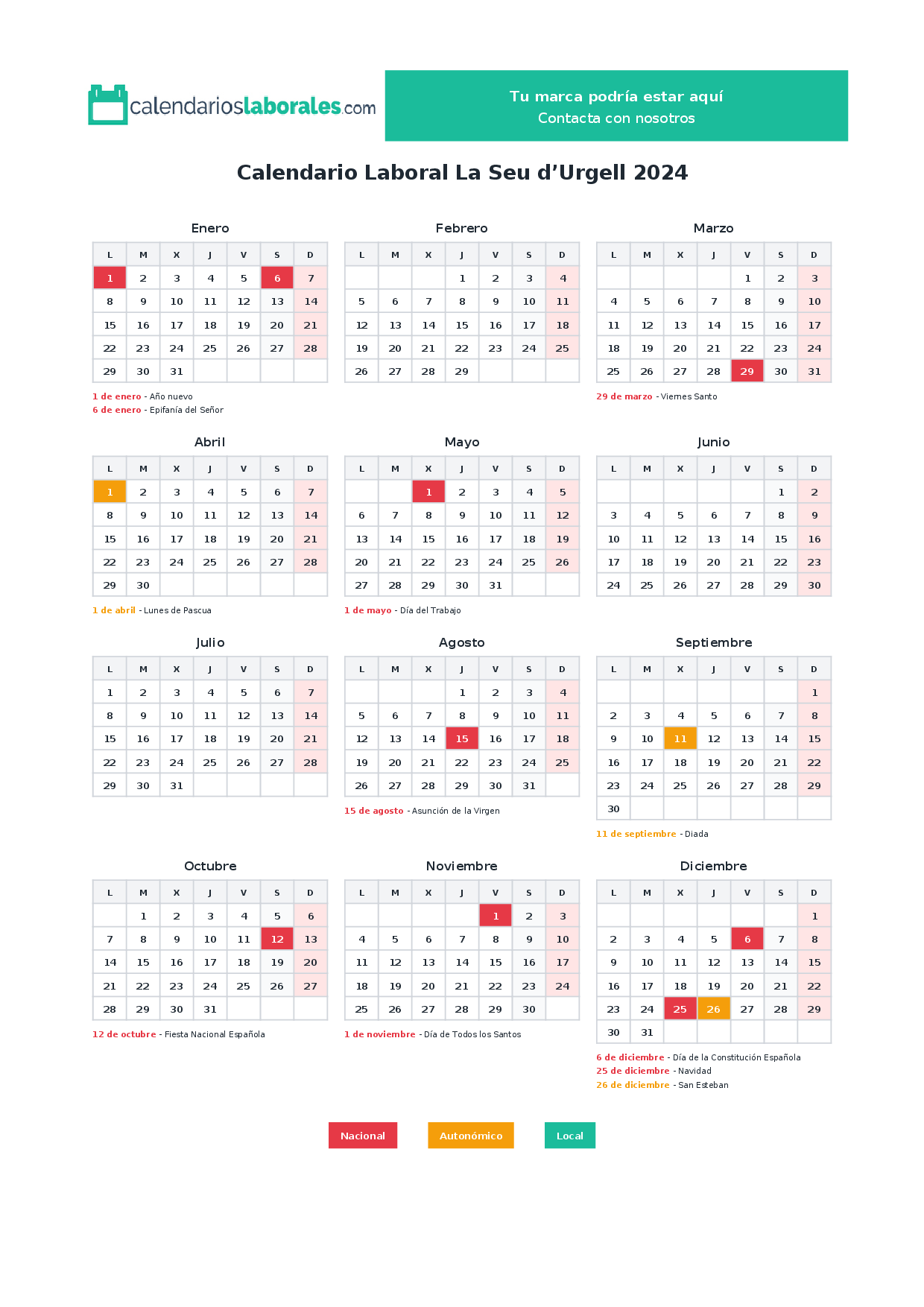Calendario laboral La Seu d’Urgell 2024