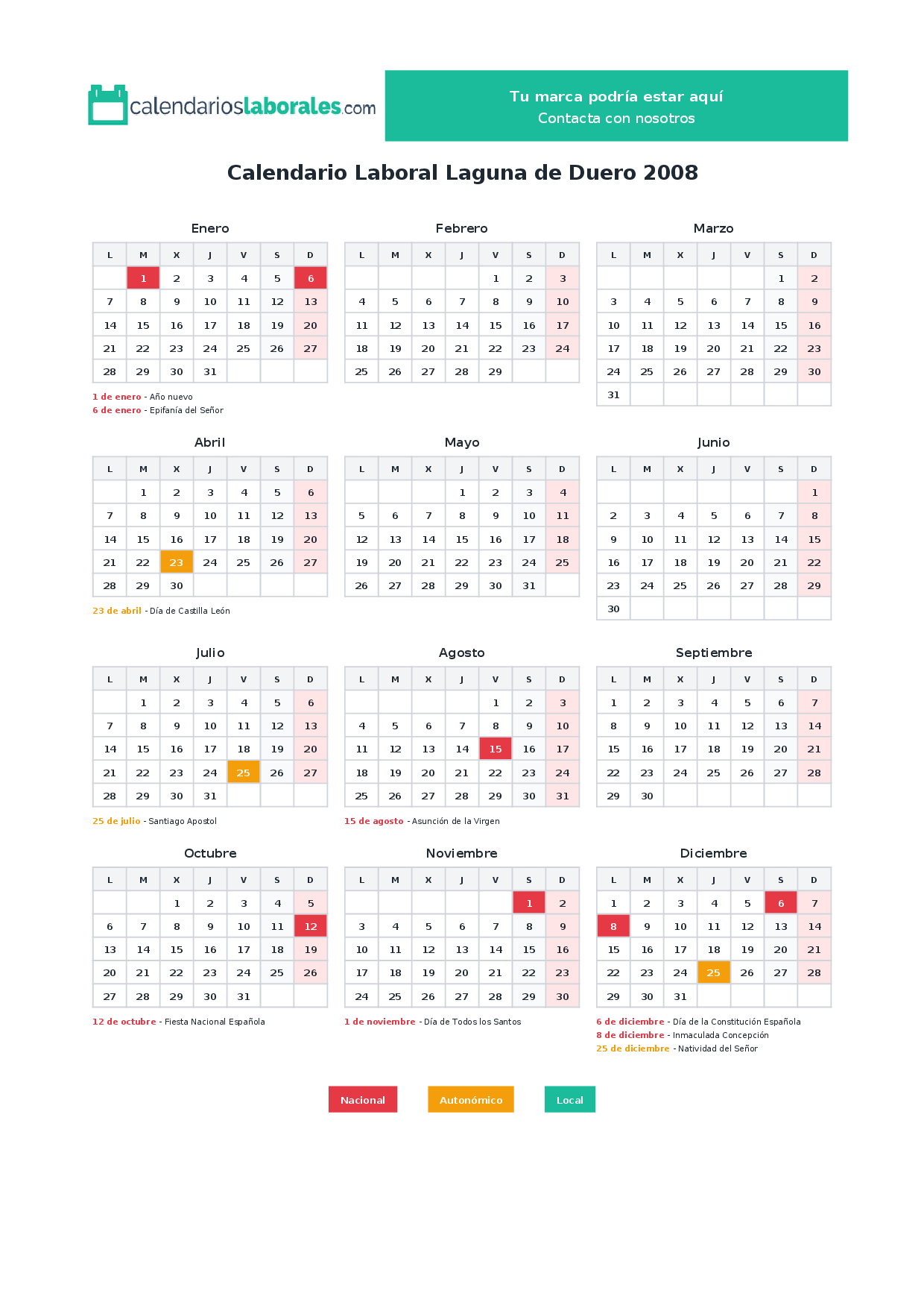 En 2008, 7 festivos nacionales se celebran en todo el territorio español, incluidos en el calendario laboral de Laguna de Duero.