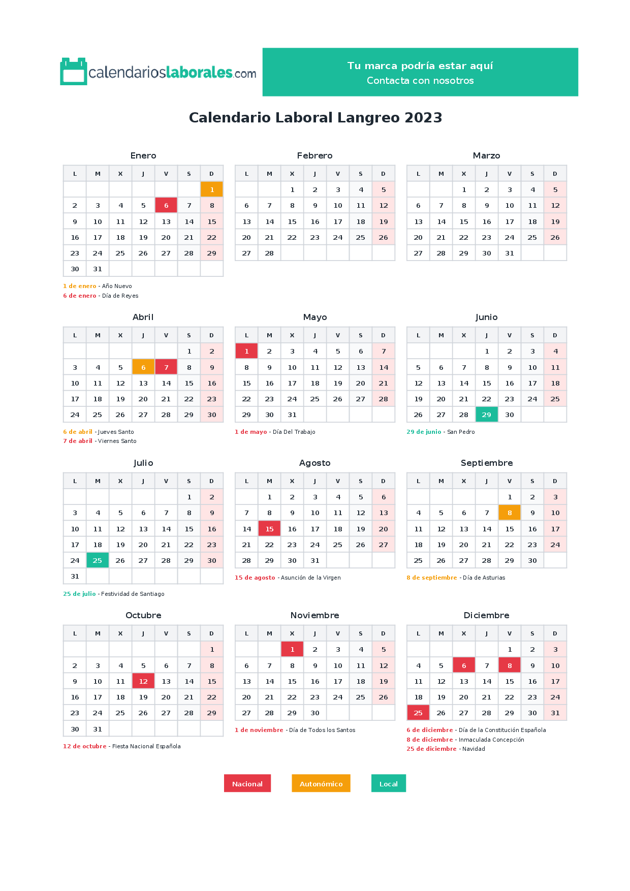 El calendario laboral de Langreo en 2023 incluye un total de 14 días festivos, que combinan festivos nacionales, festivos autonómicos de Asturias y los festivos locales propios del municipio.