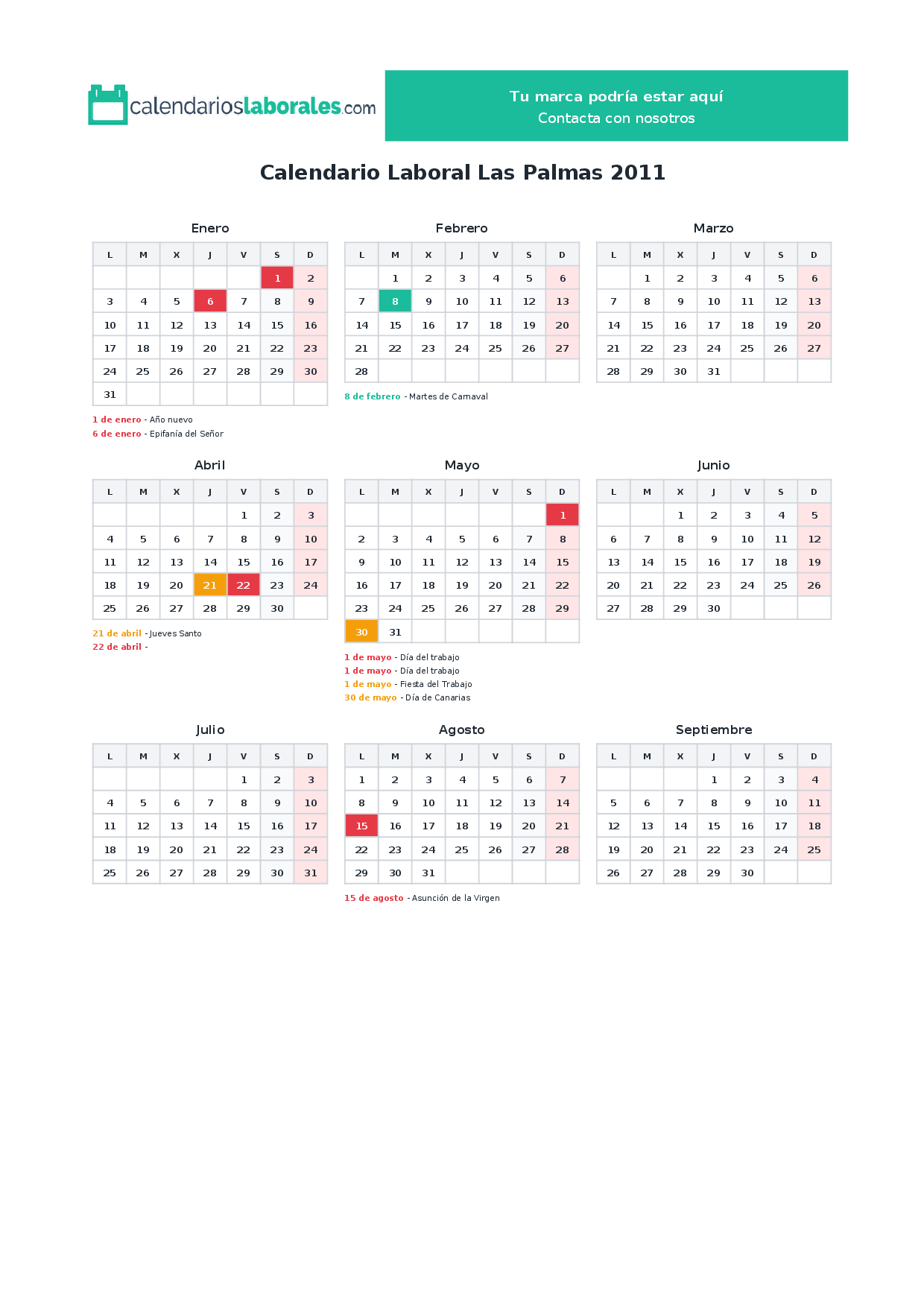 El calendario laboral de Las Palmas en 2011 cuenta con un total de 13 días festivos, que incluyen festivos nacionales, festivos autonómicos de Canarias y los festivos locales establecidos por cada municipio.