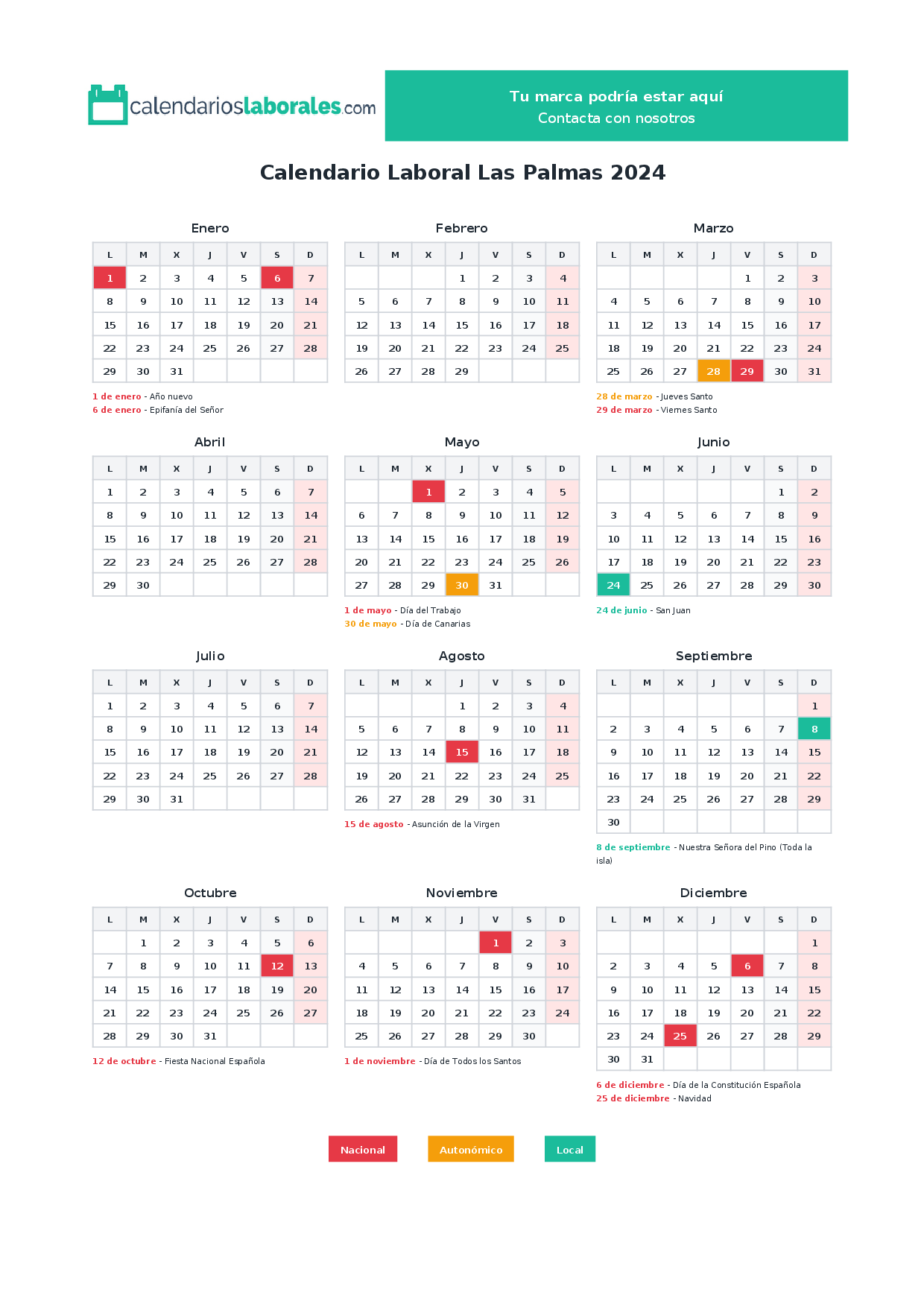 El calendario laboral de Las Palmas en 2024 cuenta con un total de 13 días festivos, que incluyen festivos nacionales, festivos autonómicos de Canarias y los festivos locales establecidos por cada municipio.