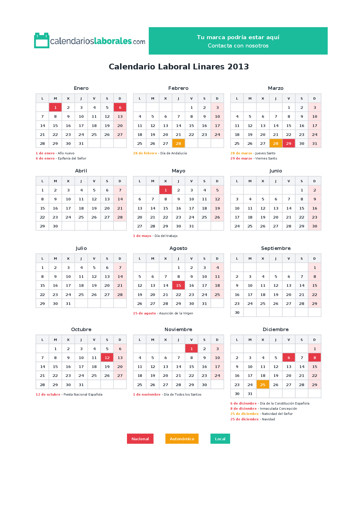En 2013, 10 festivos nacionales se celebran en todo el territorio español, incluidos en el calendario laboral de Linares.