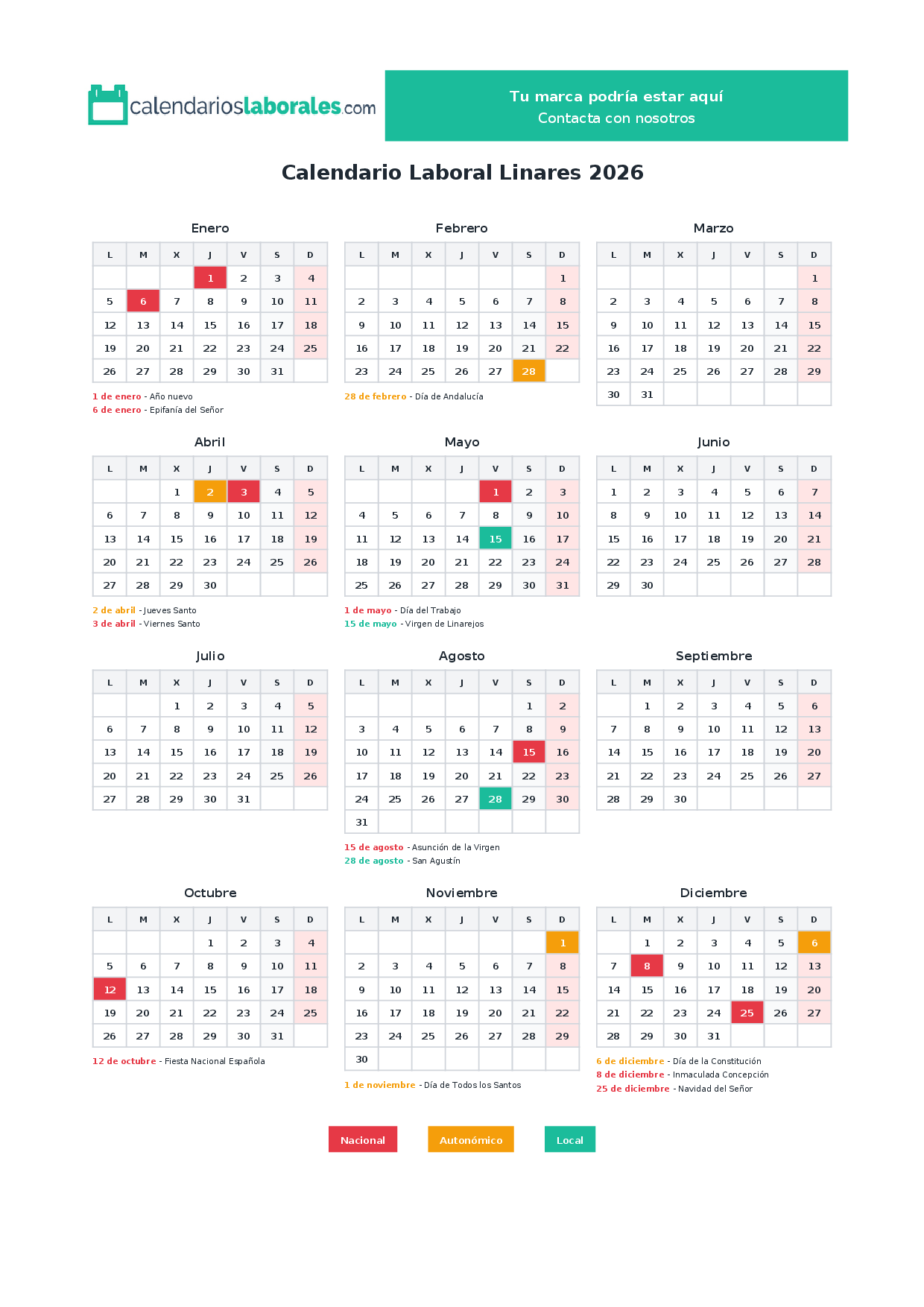 Además, el Ayuntamiento de Linares fija 2 festivos locales que completan el calendario laboral del municipio.
