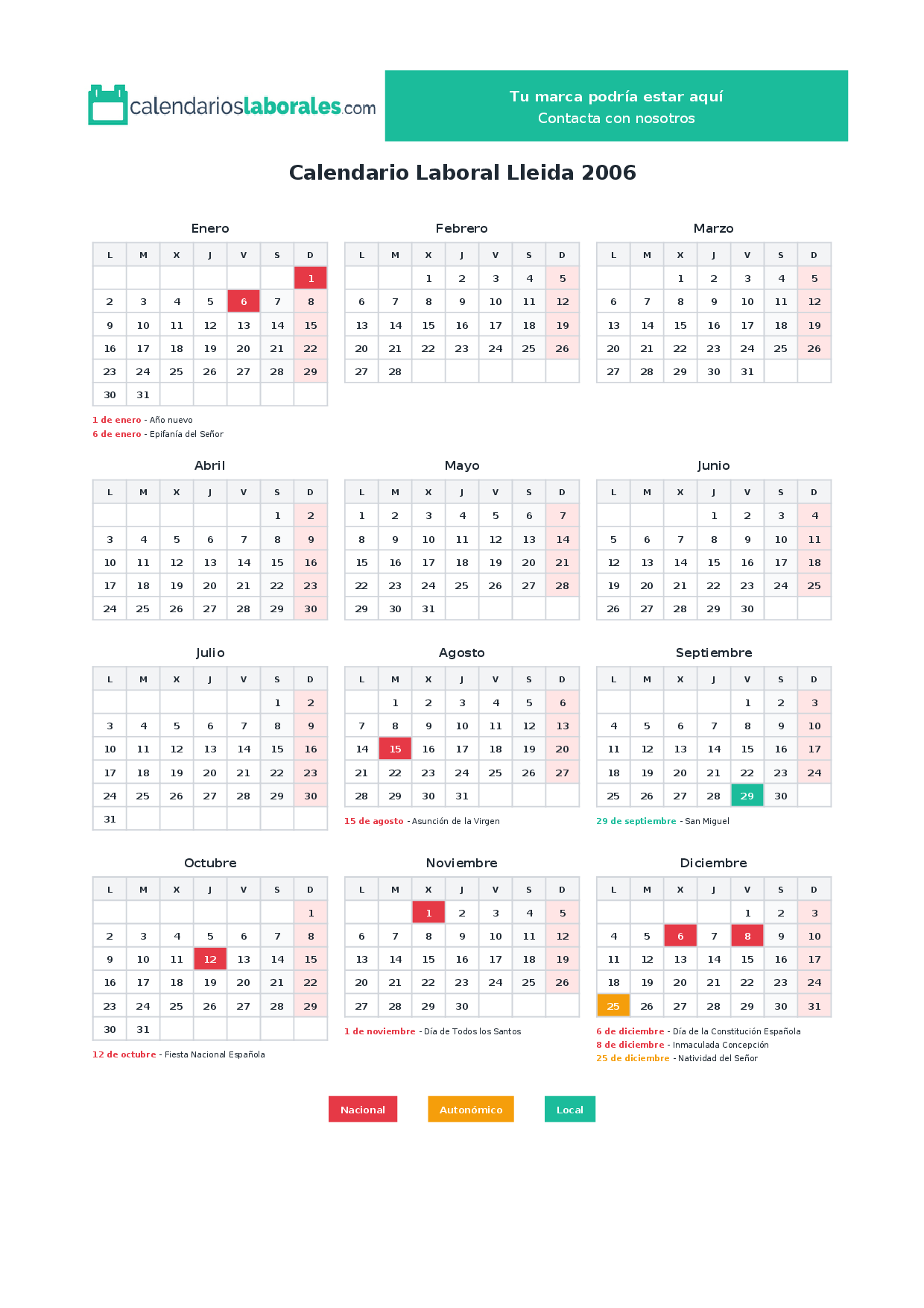 El calendario laboral de Lleida en 2006 cuenta con un total de 9 días festivos, que incluyen festivos nacionales, festivos autonómicos de Cataluña y los festivos locales establecidos por cada municipio.