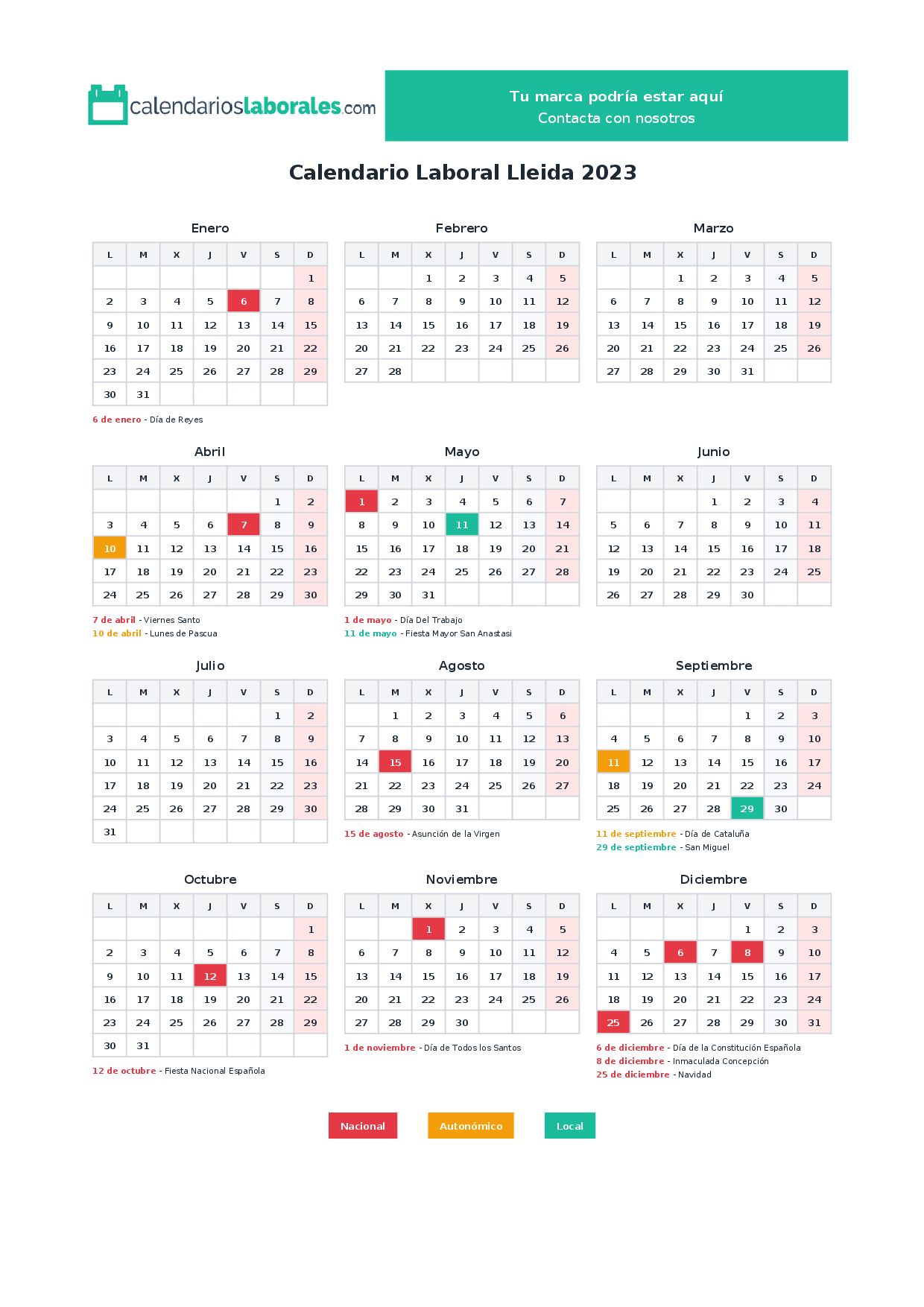 El calendario laboral de Lleida en 2023 cuenta con un total de 13 días festivos, que incluyen festivos nacionales, festivos autonómicos de Cataluña y los festivos locales establecidos por cada municipio.