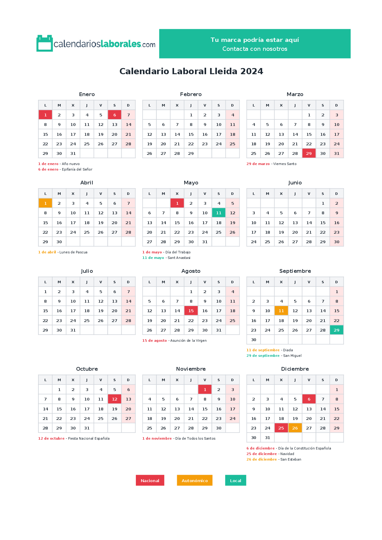El calendario laboral de Lleida en 2024 cuenta con un total de 14 días festivos, que incluyen festivos nacionales, festivos autonómicos de Cataluña y los festivos locales establecidos por cada municipio.