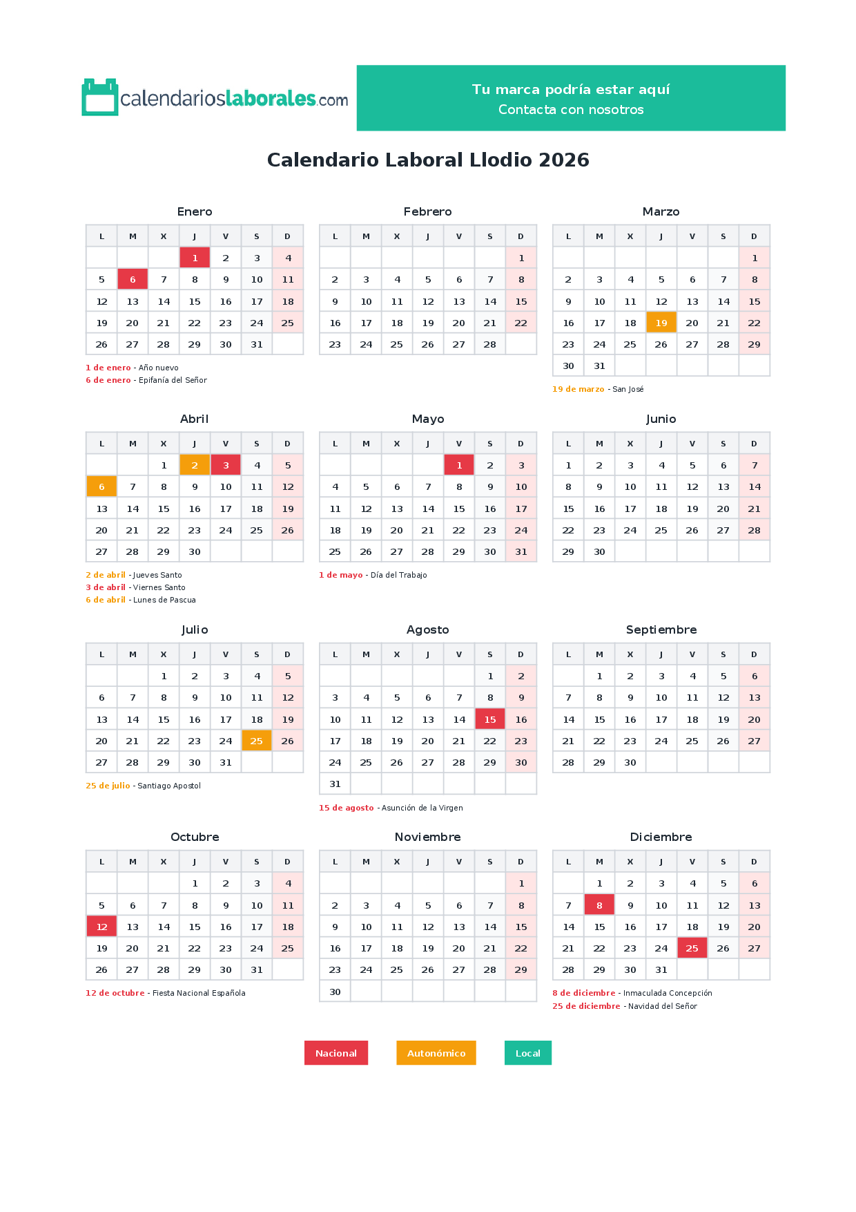 El calendario laboral de Llodio en 2026 incluye un total de 12 días festivos, que combinan festivos nacionales, festivos autonómicos de País Vasco y los festivos locales propios del municipio.