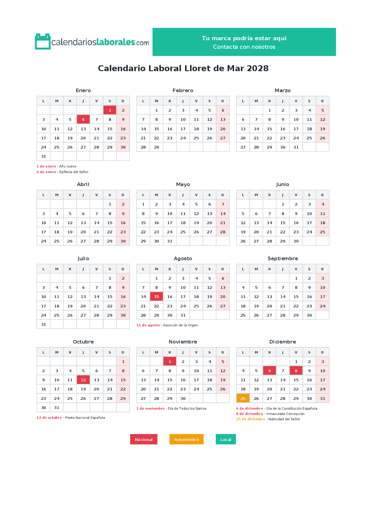 El calendario laboral de Lloret de Mar en 2028 incluye un total de 8 días festivos, que combinan festivos nacionales, festivos autonómicos de Cataluña y los festivos locales propios del municipio.