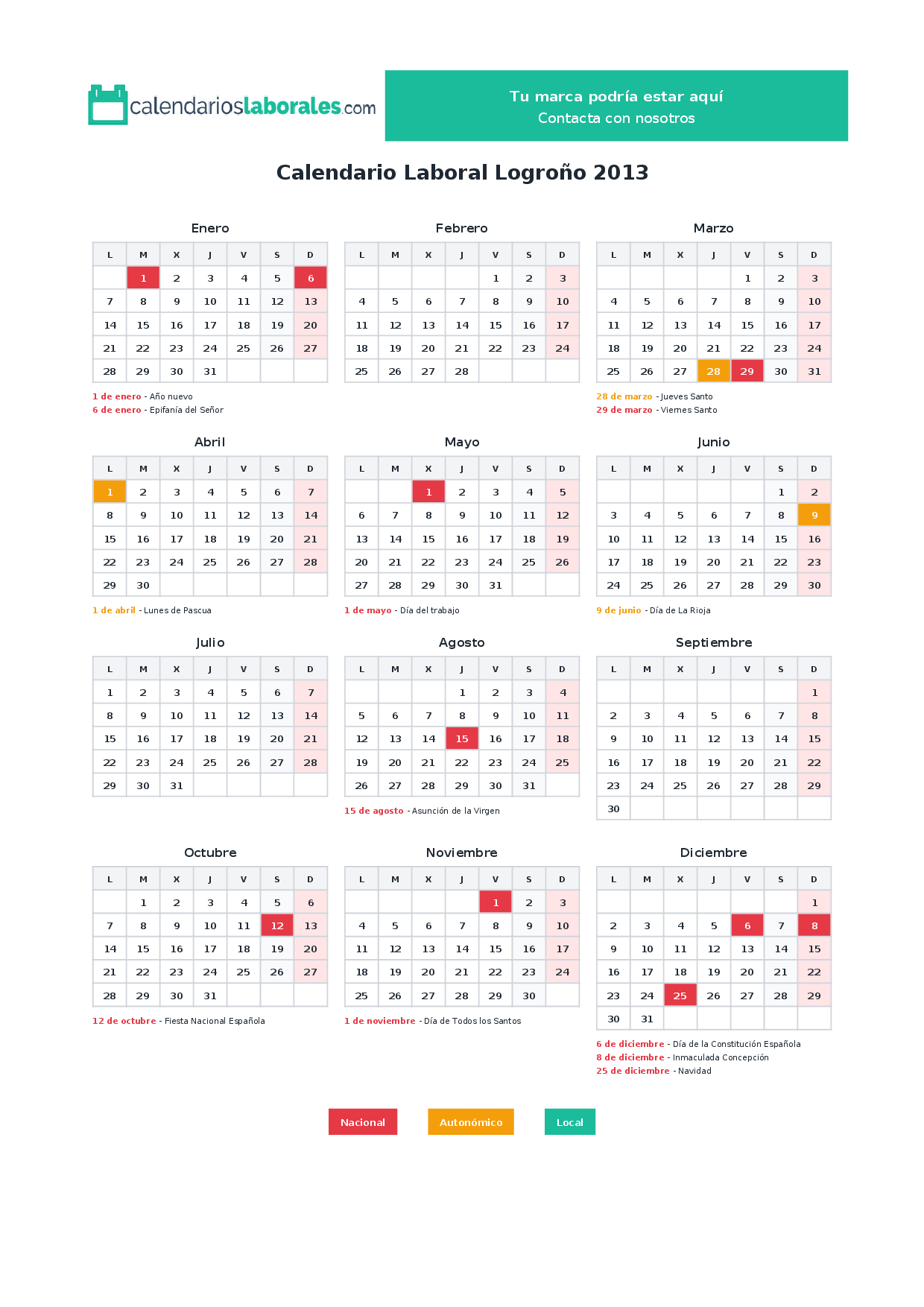 En 2013, 10 festivos nacionales se celebran en todo el territorio español, incluidos en el calendario laboral de Logroño.