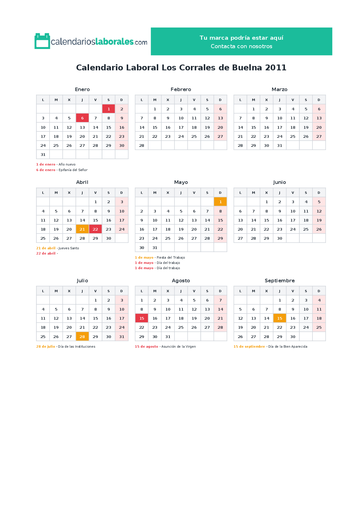 El calendario laboral de Los Corrales de Buelna en 2011 incluye un total de 13 días festivos, que combinan festivos nacionales, festivos autonómicos de Cantabria y los festivos locales propios del municipio.