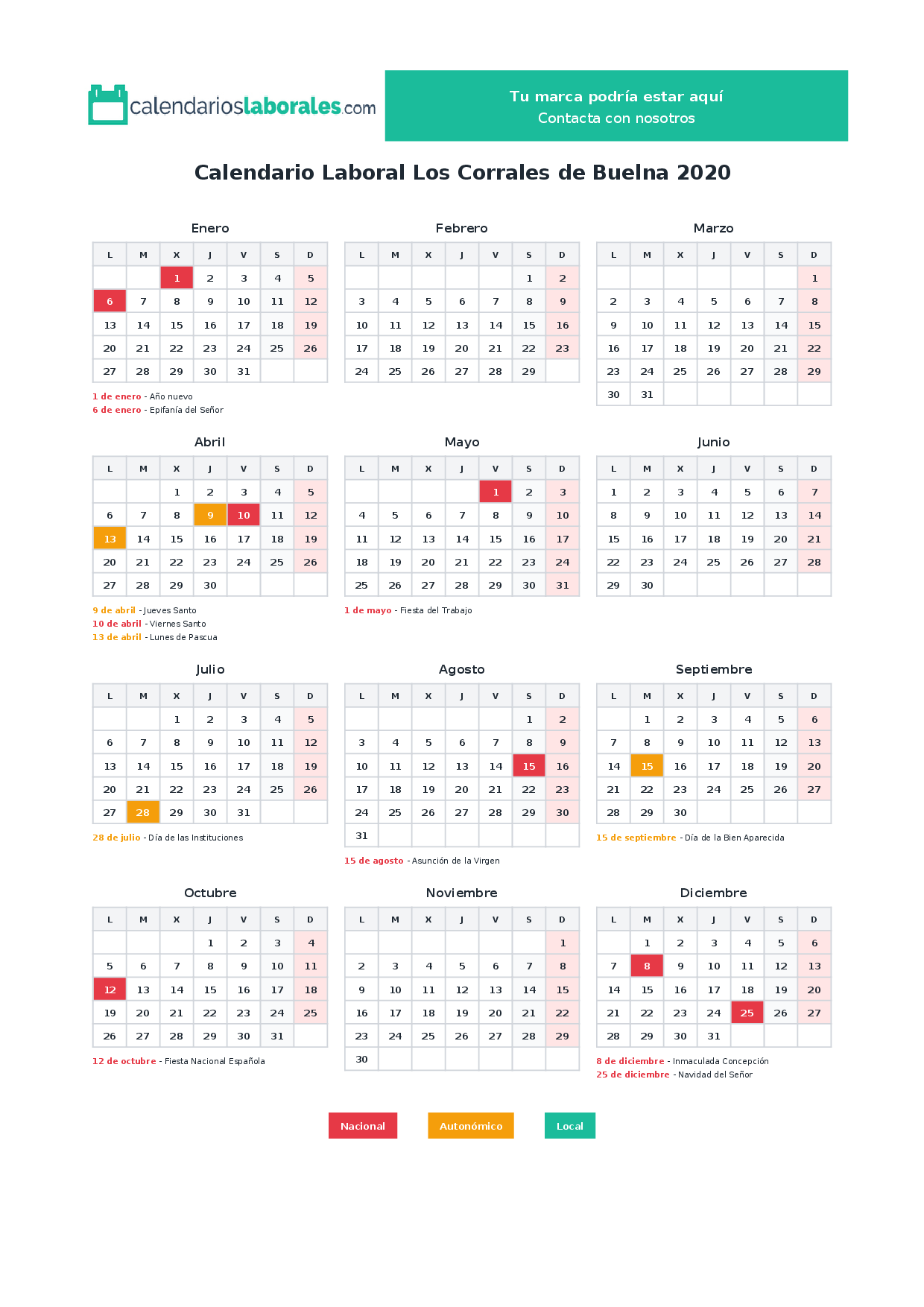 En 2020, 8 festivos nacionales se celebran en todo el territorio español, incluidos en el calendario laboral de Los Corrales de Buelna.
