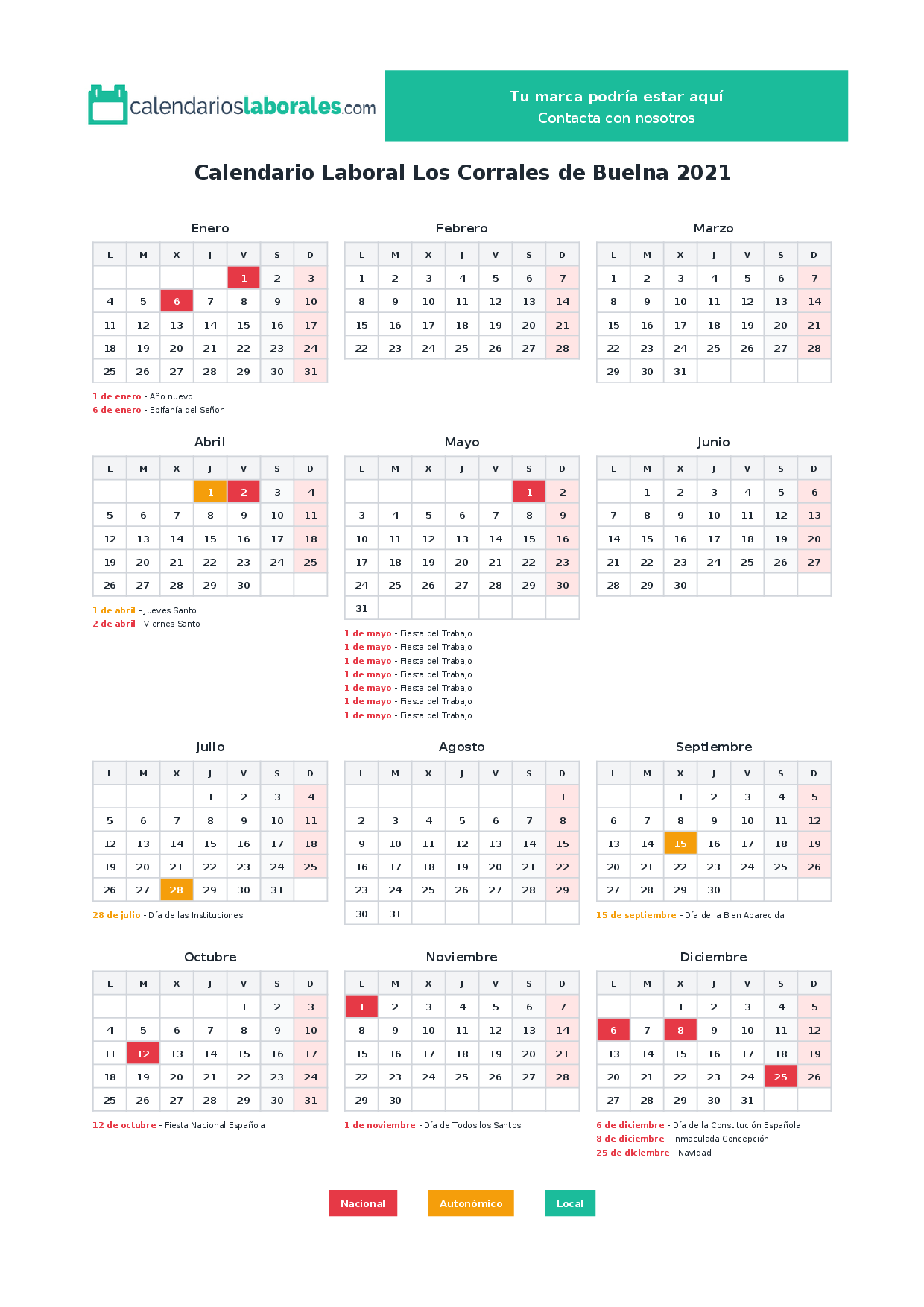 En 2021, 15 festivos nacionales se celebran en todo el territorio español, incluidos en el calendario laboral de Los Corrales de Buelna.