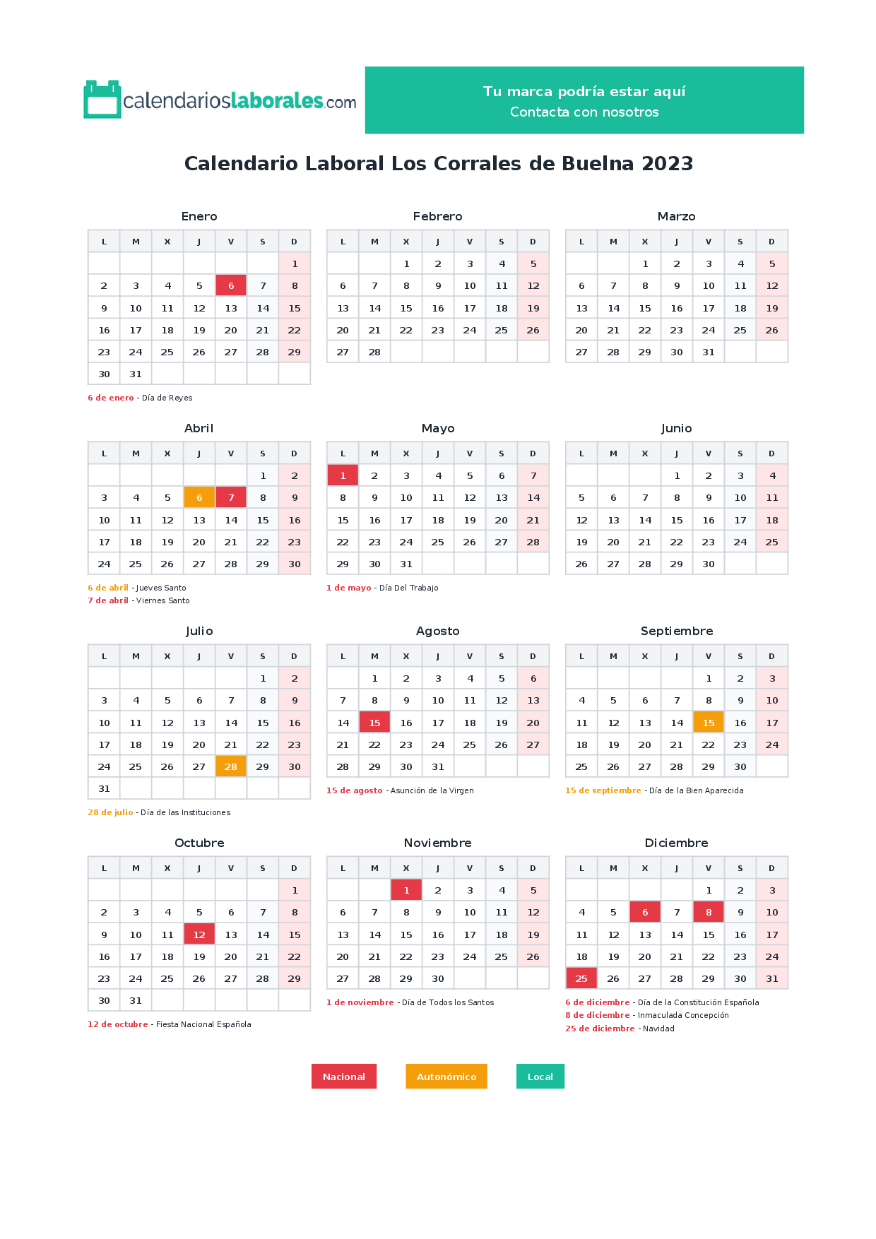 En 2023, 9 festivos nacionales se celebran en todo el territorio español, incluidos en el calendario laboral de Los Corrales de Buelna.