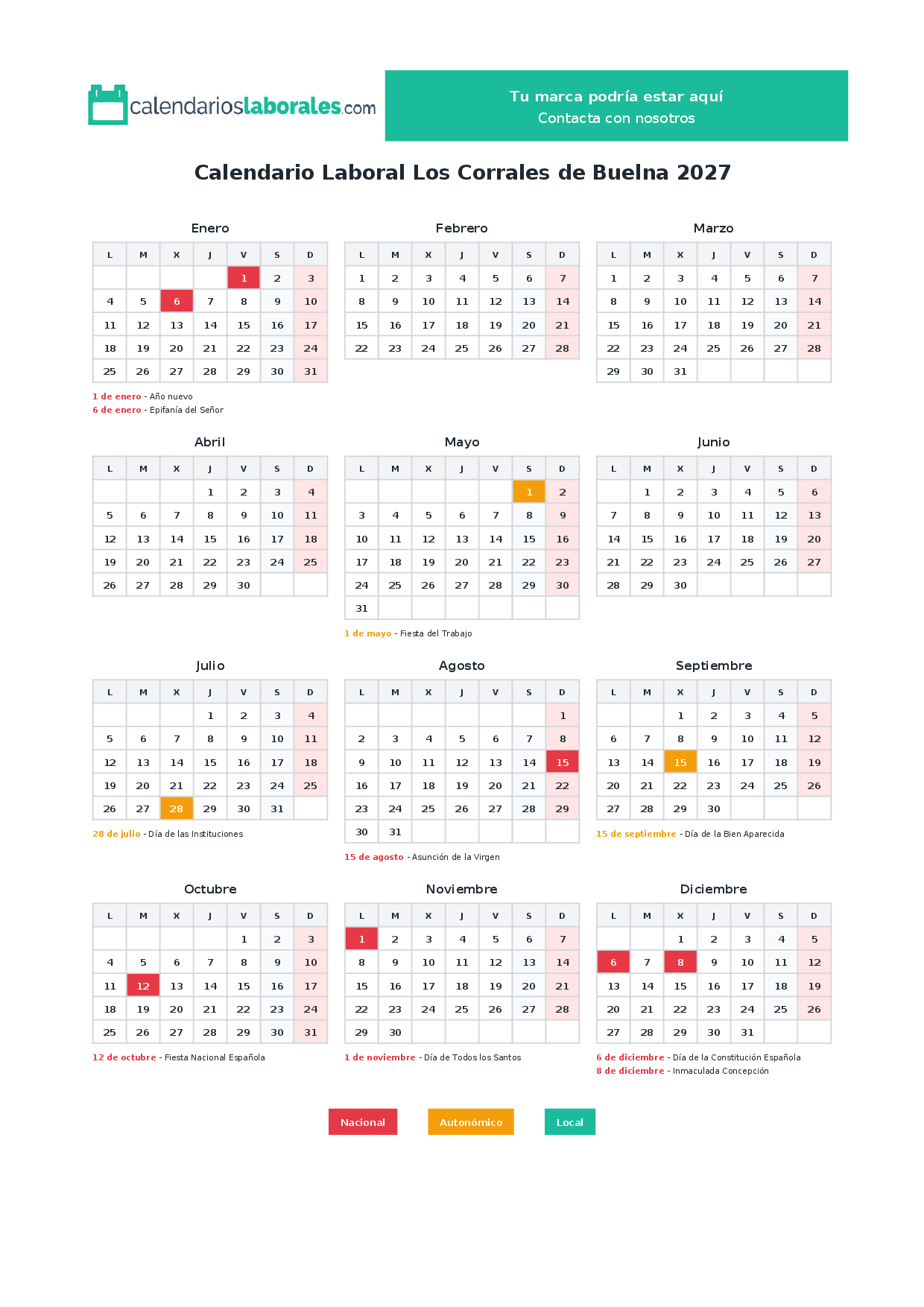 En 2027, 7 festivos nacionales se celebran en todo el territorio español, incluidos en el calendario laboral de Los Corrales de Buelna.