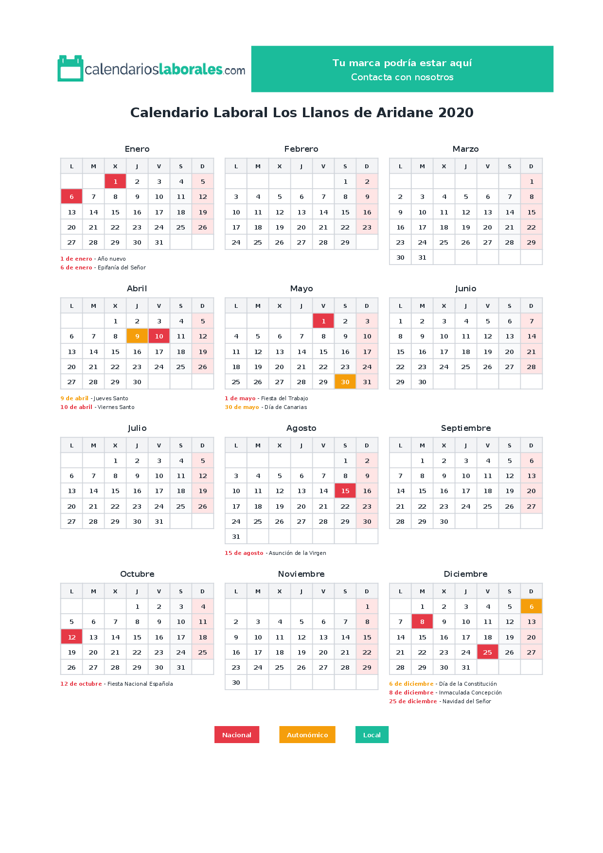 En 2020, 8 festivos nacionales se celebran en todo el territorio español, incluidos en el calendario laboral de Los Llanos de Aridane.